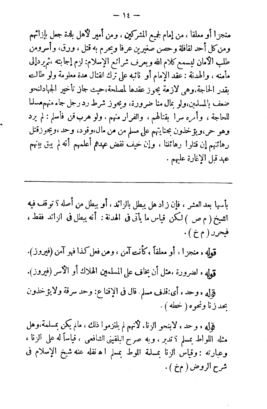 منجزا ومعلقا من إمام لجميع المشركين ومن أمير لأهل بلدة جعل بإزائهم ومن كل أحد لقافلة وحصن صغيرين عرفا ويحرم به قتل ورق وأسر ومن طلب الأمان ليسمع كلام الله ويعرف شرائع الإسلام لزم إجابته ثم يرد إلى مأمنه والهدنة عقد الإمام أ و نائبه على ترك القتال مدة معلومة ولو طالت بقدر الحاجة وهي لازمة يجوز عقدها لمصلحة حيث جاز تأخير الجهاد لنحو ضعف بالمسلمين ولو بمال منا ضرورة ويجوز شرط رد رجل جاء منهم مسلما للحاجة وأمره سرا بقتالهم والفرار منهم ولو هرب قن فأسلم لم يرد وهو حر ويؤخذون بجنايتهم على مسلم من مال وقود وحد ويجوز قتل رهائنهم إن قتلوا رهائننا وإن خيف نقض عهدهم أعلمهم أنه لم يبق بينه وبينهم عهد قبل الإغارة عليهم
