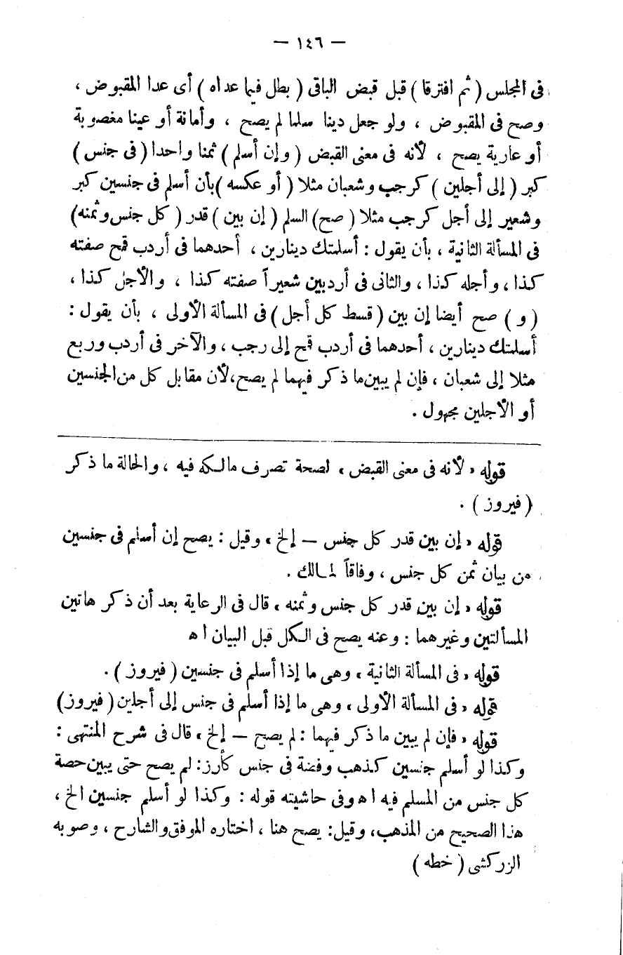 في المجلس ( ثم افترقا ) قبل قبض الباقي ( بطل فيما عداه ) أي عدا المقبوض وصح في المقبوض ولو جعل دينا سلما لم يصح وأمانة أو عينا مغصوبة أو عارية يصح لأنه في معنى القبض ( وإن أسلم ) ثمنا واحدا ( في جنس ) كبير ( إلى أجلين ) كرجب وشعبان مثلا ( أو عكسه ) بأن أسلم في جنسين كبر وشعير إلى أجل كرجب مثلا ( صح ) السلم ( إن بين ) قدر ( كل جنس وثمنه ) في المسألة الثانية بأن يقول أسلمتك دينارين أحدهما في أردب قمح صفته كذا وأجله كذا والثاني في أردبين شعيرا صفته كذا والأجل كذا ( و ) يصح أيضا إن بين ( قسط كل أجل ) في المسألة الأولى بأن يقول أسلمتك دينارين أحدهما في أردب قمح إلى رجب والآخر في أردب وربع مثلا إلى شعبان فإن لم يبين ما ذكر فيهما لم يصح لأن مقابل كل من الجنسين أو الأجلين مجهول