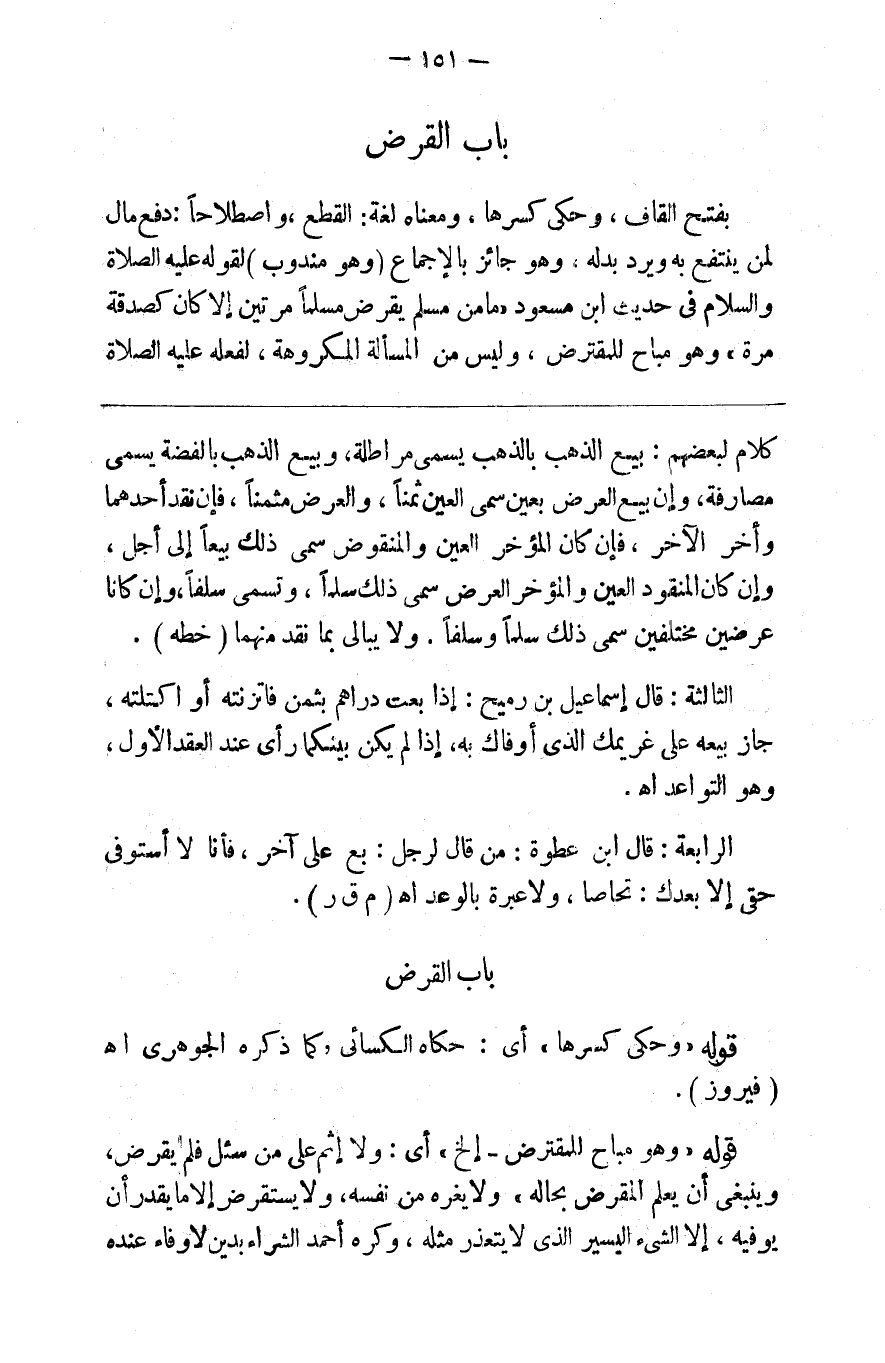 بفتح القاف وحكي كسرها ومعناها لغة القطع واصطلاحا دفع مال لمن ينتفع بة ويرد بدله وهو جائز بالإجماع ( وهو مندوب ) لقوله صلى الله عليه وسلم في حديث ابن مسعود ما من مسلم يقرض مسلما قرضا مرتين إلا كان كصدقة مرة وهو مباح للمقترض وليس من المسألة المكروهة لفعله عليه الصلاة