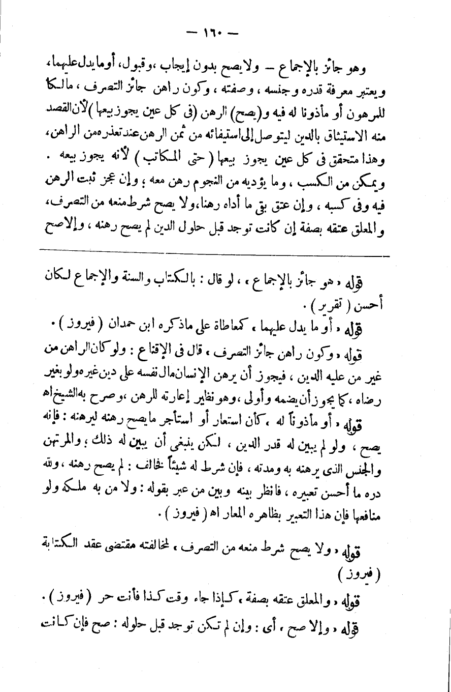 وهو جائز بالإجماع ولا يصح بدون إيجاب وقبول أو ما يدل عليهما ويعتبر معرفة قدره وجنسه وصفته وكون راهن جائز التصرف مالكا للمرهون أو مأذونا له فيه و ( يصح ) الرهن ( في كل عين يجوز بيعها ) لأن القصد منه الاستيثاق بالدين ليتوصل إلى استيفائه من ثمن الرهن عند تعذره من الراهن وهذا متحقق في كل عين يجوز بيعها ( حتى المكاتب ) لأنه لايجوز بيعه ويمكن من الكسب ما يؤديه من النجوم رهن معه وإن عجز ثبت الرهن فيه وفي كسبه وإن عتق بقي ما أداه رهنا ولا يصح شرط منعه من الصترف والمعلق عتقه بصفة إن كانت توجد قبل حلول الدين لم يصح رهنه وإلا صح