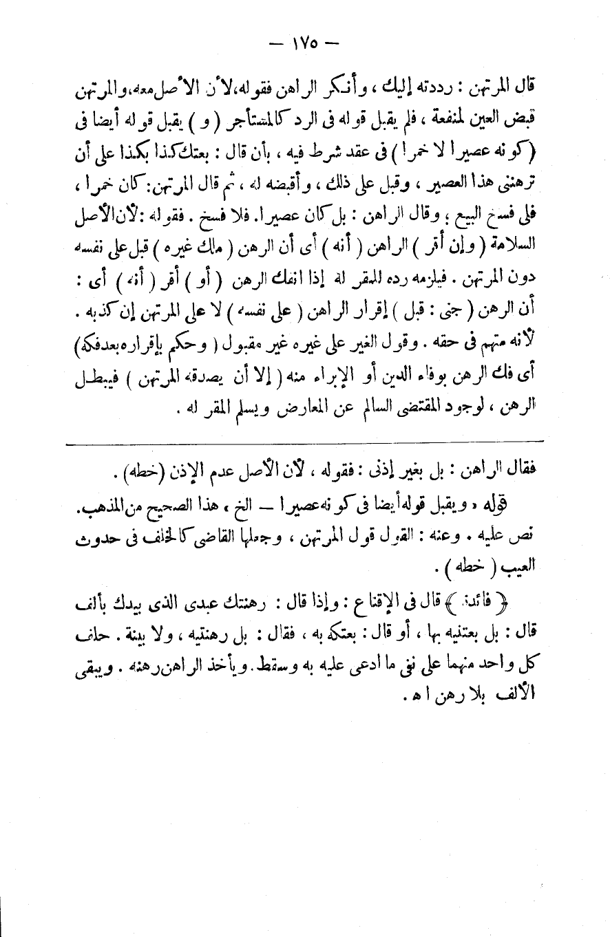 قال المرتهن رددته إليك وأنكر الراهن فقوله لأن الأصل معه والمرتهن قبض العين لمنفعته فلم يقبل قوله في الرد كالمستأجر ( و ) يقبل قوله أيضا ( في كونه عصيرا لا خمرا ) في عقد شرط فيه بأن قال بعتك كذا بكذا على أن ترهنني هذا العصير وقبل على ذلك وأقبضه له ثم قال المرتهن كان خمرا فلي فسخ البيع وقال الراهن بل كان عصيرا فلا فسخ فقوله لأن الأصل السلامة ( وإن أقر ) الراهن ( أنه ) أي أن الرهن ( أو ) أقر ( أنه ) أي أن الرهن ( ملك غيره ) قبل على نفسه دون المرتهن فيلزمه رده للمقر له إذا انفط الرهن ( جنى قبل ) إقرار الراهن ( على نفسه ) لا على المرتهن إن كذبه لأنه متهم في حقه وقول الغير على غيره غير مقبول ( وحكم بإقراره بعد فكه ) أي فك الرهن بوفاء الدين أو الإبراء منه ( إلا أن يصدقه المرتهن ) فيبطل الرهن لوجود المقتضى السالم عن المعارض ويسلم له به %