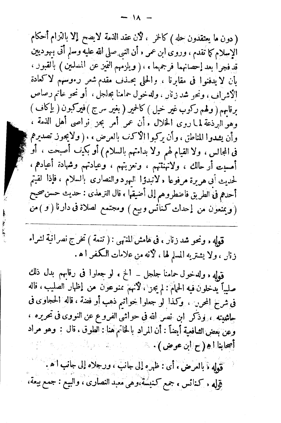 ( دون ما يعتقدون حله ) كالخمر لأن عقد الذمة لا يصح إلا بالتزام أحكام الإسلام كما تقدم وروى ابن عمر أن النبي صلى الله عليه وسلم أتي بيهوديين قد فجرا بعد إحصانهما فرجهما ( ويلزمهم التميز عن المسلمين ) بالقبور بأن لايدفنوا في مقابرنا والحلي بحذف مقدم رؤوسهم لا كعادة الأشراف ونحو شد زنار ولدخول حمامنا بجلجل أو نحو خاتم رصاص برقابهم ( ولهم ركوب غير الخيل ) كالحمير ( بغير سرج ) فيركبون ( بإكاف ) وهو البرذعة لما روى الخلال أن عمر أمر بجز نواصي أهل الجزيرة وأن يشدوا المناطق وأن يركبوا الأ كف بالعرض ( ولا يجوز تصديرهم في المجالس ولا القيام لهم ولا بدأتهم بالسلام ) أو ب كيف أصبحت أو أمسيت أو حالك ولا تهنئتهم وتعزيتهم وعيادتهم وشهادة أعيادهم لحديث أبى هريرة مرفوعا لا تبدؤوا اليهود والنصارى بالسلام فإذا لقيتم أحدهم في الطريق فاضطروهم إلى أضيقها قال الترمذي حديث حسن صحيح ( ويمنعون من إحداث كنائس وبيع ) ومجتمع لصلاة في دارنا ( و ) من