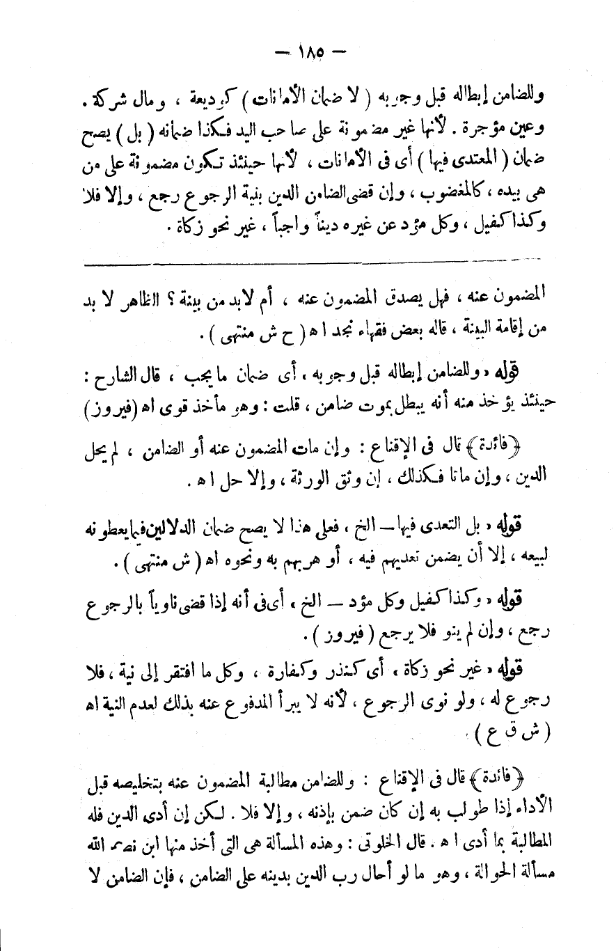 @ 185 وللضامن إبطال قبل وجوبه لا ( ضامن الأمانات كوديعة ) ومال شركة وعين مؤجرة لأنها غير مضمونة على صاحب اليد فكذا ضامنه ( بل ) يصح ضمان ( التعدي فيها ) أي في الأمانات لأنها حينئذ تكون مضمونة على من هي بيده كالمغصوب وإن قضى الضامن الدين بنية الرجوع رجع وإلا فلا وكذا كفيل وكل مؤد عن غيره دينا واجبا غير نحو زكاة