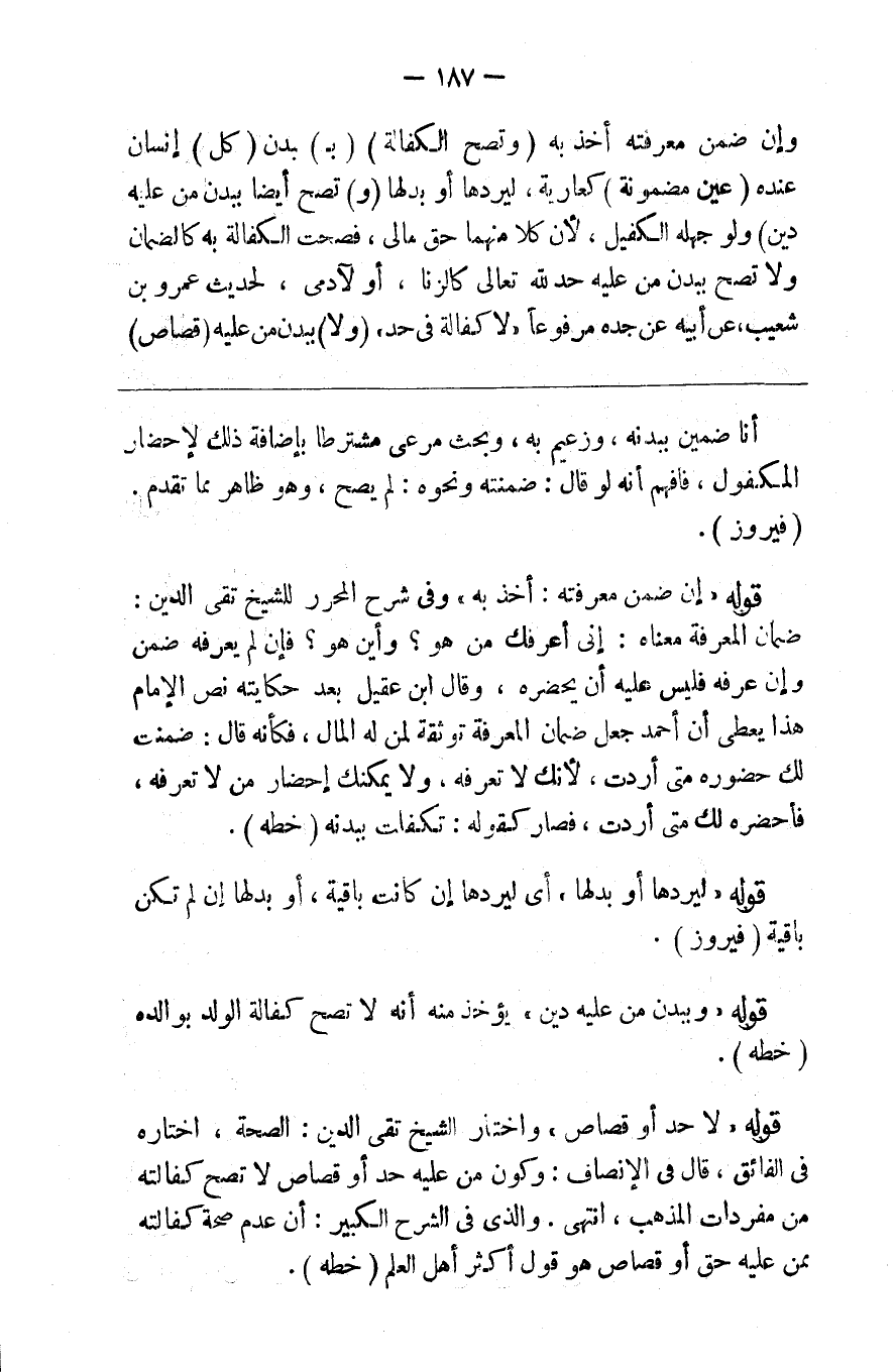 وإن ضمن معرفته أخذ به ( وتصح الكفالة ب ) بدن ( كل ) إنسان عنده ( عين مضمونة ) كعارية ليردها أو بدلها ( و ) تصح أيضا ( ببدن من عليه دين ) ولو جهله الكفيل لأن كلا منهما حق مالي فصحت الكفالة به كالضمان و ( لا ) تصح ببدن من عليه ( حد ) لله تعالى كالزنا أو لآدمي كالقذف لحديث عمرو بن شعيب عن أبيه عن جده مرفوعا لا كفالة في حد ( ولا ) ببدن من عليه ( قصاص )