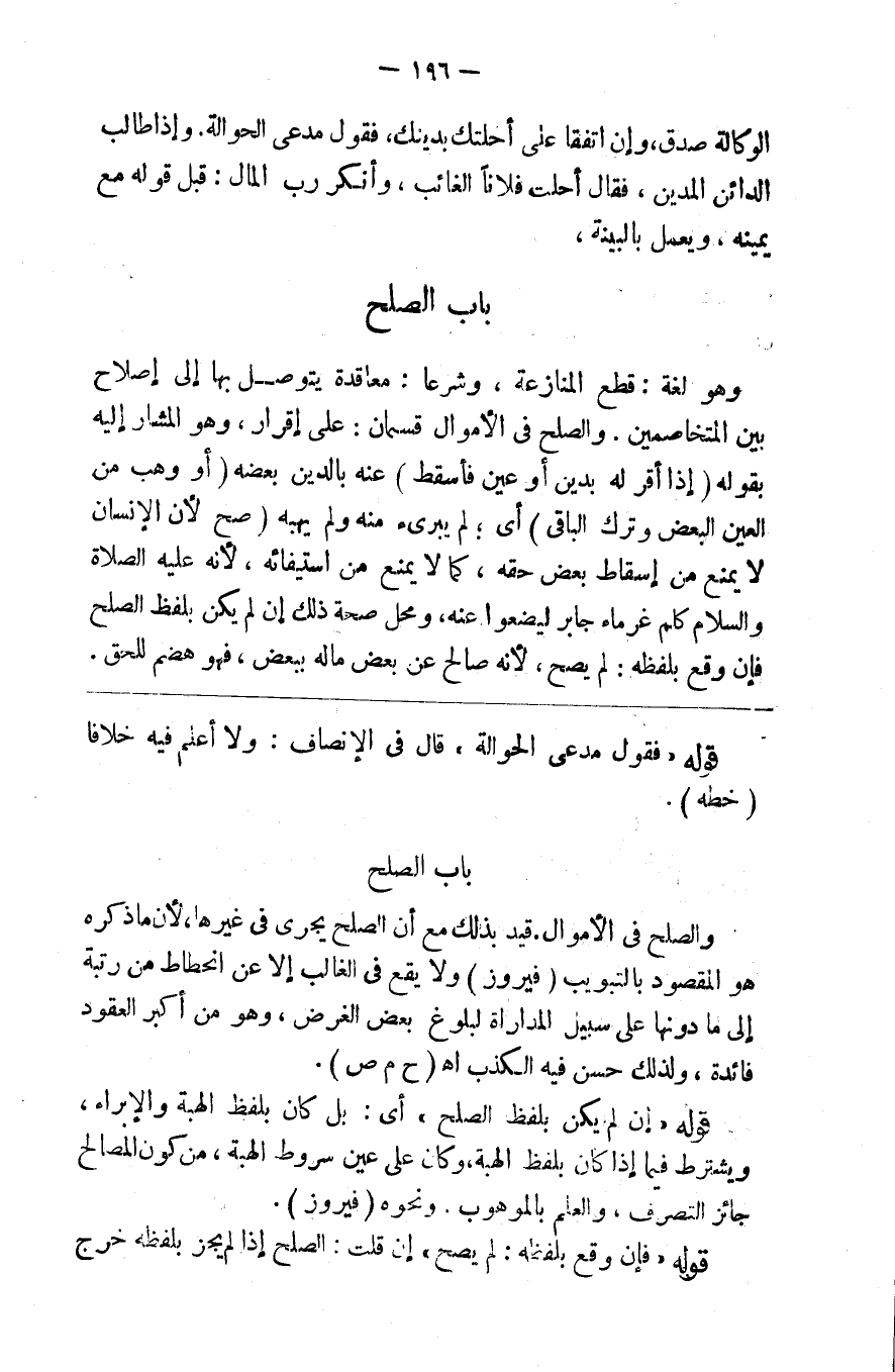 صدق وإن اتفقا على أحلتك بدينك فقول مدعي الحوالة وإذا طالب الدائن المدين فقال أحلت فلانا الغائب وأنكر رب المال قبل قوله مع يمينه ويعمل بالبينة 10 باب الصلح