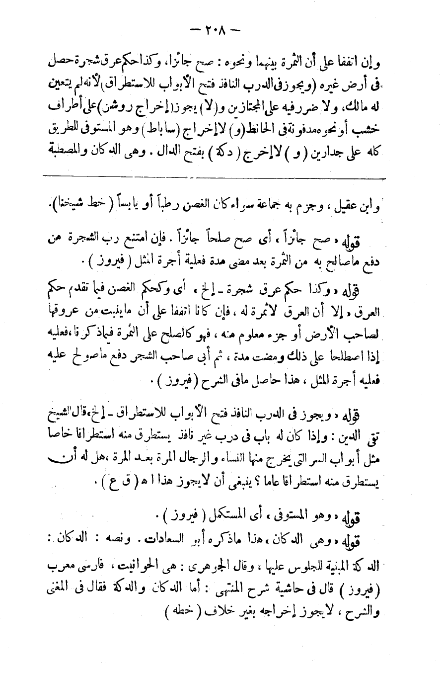 وإن اتفقا على أن الثمرة بينهما ونحوه صح جائزا وكذا حكم عرق شجرة حصل في أرض غيره ( ويجوز في الدرب النافذ فتح الأبواب للاستطراق ) لأنه لم يتعين له مالك ولا ضرر فيه على المجتازين و ( لا ) يجوز ( إخراج روشن ) على أطراف خشب أو نحوه مدفونة في الحائط ( و ) لا إخراج ( ساباط ) وهو المستوفي للطريق كله على جدارين ( و ) لا إخراج ( دكة ) بفتح الدال وهي الدكان والمصطبه