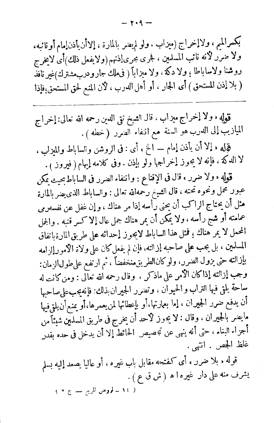 بكسر الميم ( و ) لا إخراج ( ميزاب ) ولو لم يضر بالمارة إلا أن يإذن إمام أو نائبه ولا ضرر لأنه نائب المسلمين فجرى مجرى إذنهم ( ولا يفعل ذلك ) أي لا يخرج روشنا ولا ساباطا ولا دكة ولا ميزابا ( في ملك جار ودرب مشترك ) غير نافذ ( بلا إذن المستحق ) أي الجار أو أهل الدرب لأن المنع لحق المستحق فإذا رضي