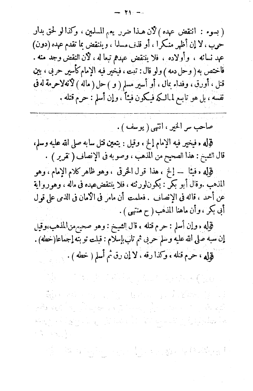 ( بسوء انتقض عهده ) لأن هذا ضرر يعم المسلمين وكذا لو لحق بدار حرب لا إن أظهر منكرا أو قذف مسلما وينقض بما تقدم عهده ( دون ) عهد ( نسائه وأولاده ) فلا ينتقض عهدهم تبعا له لأن النقض وجد منه فاختص به ( وحل دمه ) ولو قال تبت فيخير فيه الإمام كأسير حربي بين قتل ورق ومن وفداء بمال أو أسير مسلم ( و ) حل ( ماله ) لأنه لا حرمة له في نفسه بل هو تابع لمالكه فيكون فيئا وإن أسلم حرم قتله