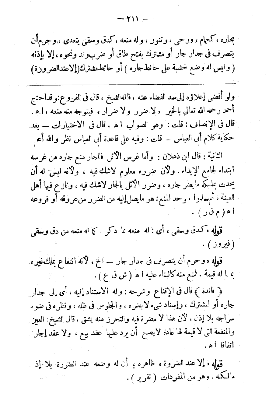 بجاره كحمام ورحى وتنور وله منعه كدق وسقي يتعدى وحرم أن يتصرف في جدار جار أو مشترك بفتح طاق أو ضرب وتد ونحوه إلا بإذنه ( وليس له وضع خشبة على حائط جاره ) أو حائط مشترك ( إلا عند الضرورة )