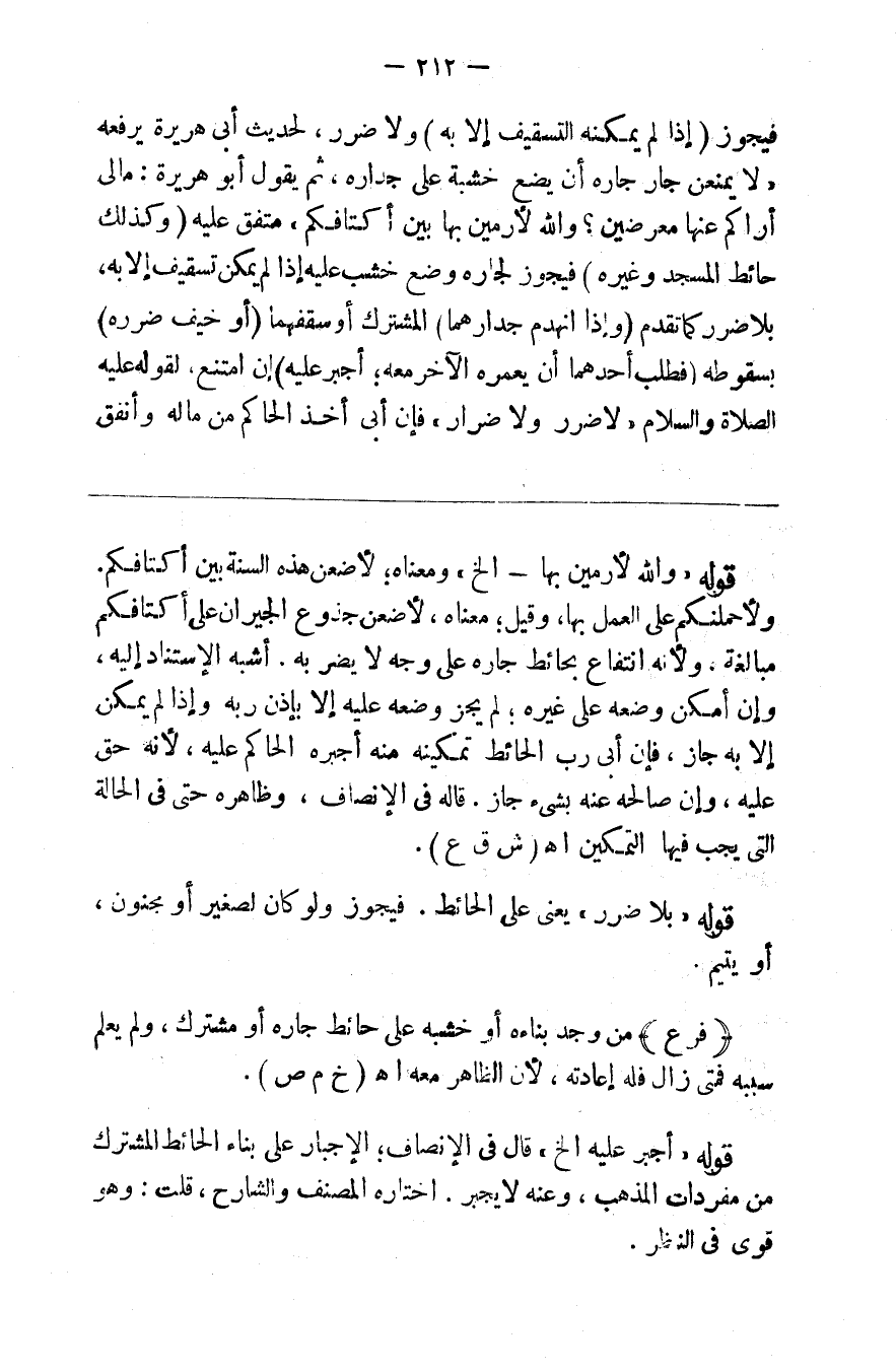 فيجوز ( إذا لم يمكنه التسقيف إلا به ) ولا ضرر لحديث أبي هريرة يرفعه لا يمنعن جار جاره أن يضع خشبة على جداره ثم يقول أبو هريرة ما لي أراكم عنها معرضين والله لأرمين بها بين أكتافكم متفق عليه ( وكذلك ) حائط ( المسجد وغيره ) كحائط نحو يتيم فيجوز لجاره وضع خشبة عليه إذا لم يمكن تسقيف إلا به بلا ضرر لما تقدم ( وإذا انهدم جدارهما ) المشترك أو سقفها ( أو خيف ضرره ) بسقوطه ( فطلب أحدهما أن يعمره الآخر معه أجبر عليه ) إن امتنع لقوله صلى الله عليه وسلم لا ضرر ولا ضرار فإن أبى أخذ حاكم من ماله
