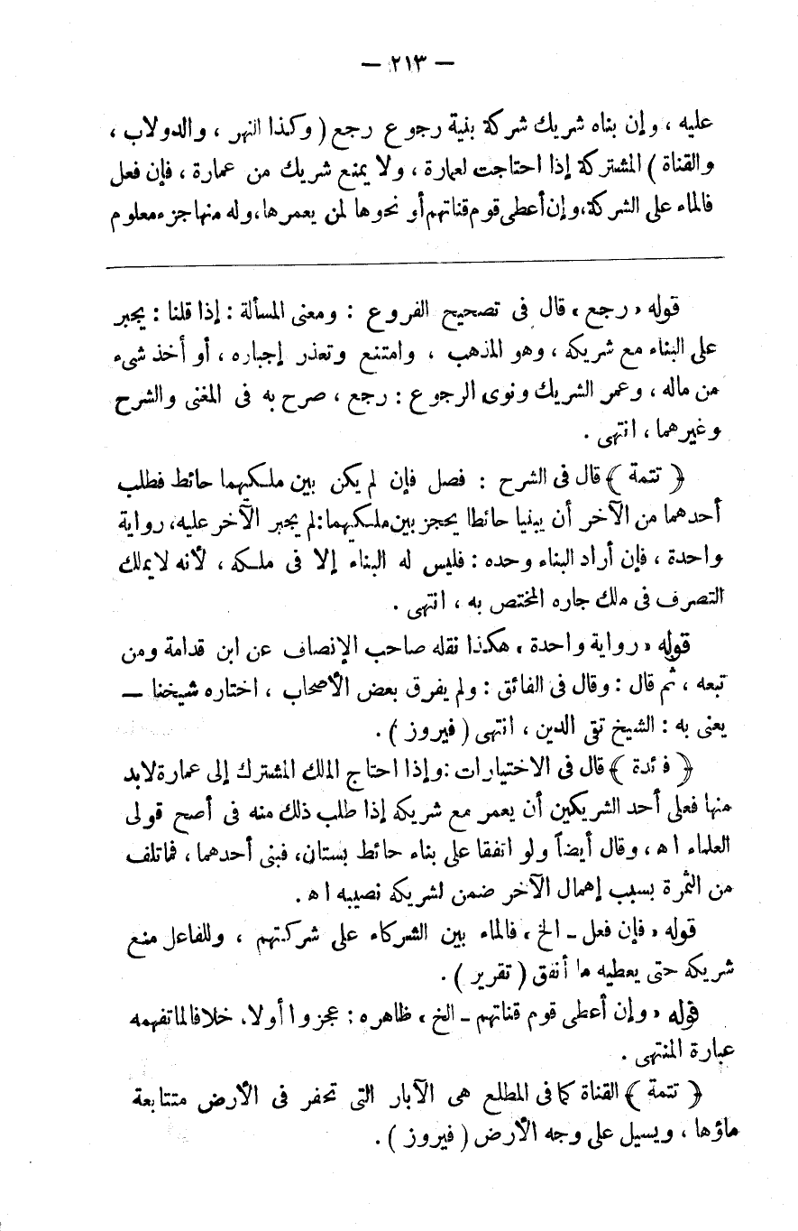 وأنفق عليه وإن بناه شريك شركة بنية رجوع رجع ( وكذا النهر والدولاب والقناة ) المشتركة إذا احتاجت لعمارة ولا يمنع شريك من عمارة فإن فعل فالماء على الشركة وإن أعطى قوم قناتهم أو نحوها لمن يعمرها وله منها جزء معلوم
