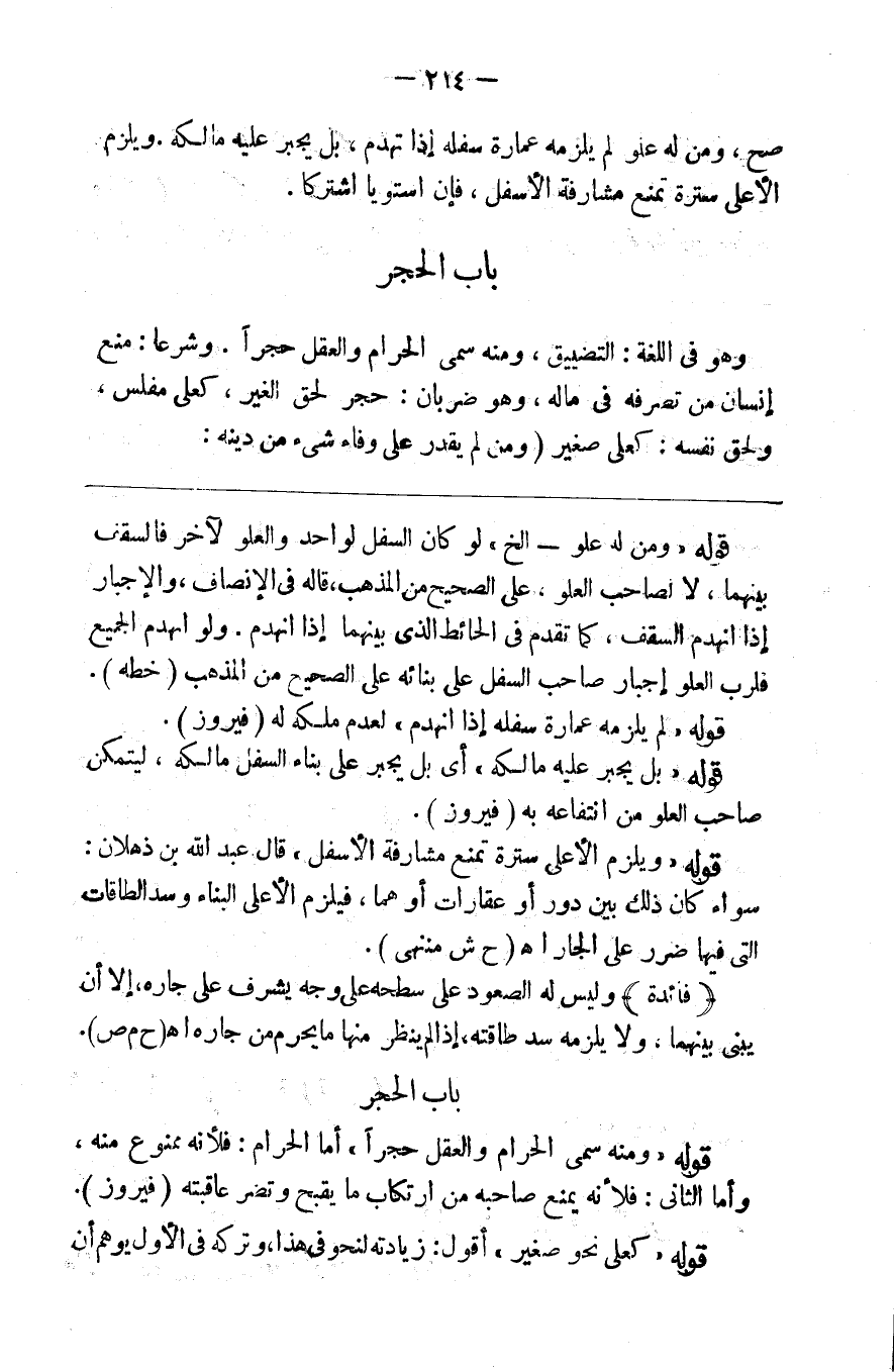 صح ومن له علو لم يلزمه عمارة سفله إذا انهدم بل يجبر عليه مالكه ويلزم الأعلى سترة تمنع مشارفة الأسفل فإن استويا اشتركا 11 باب الحجر