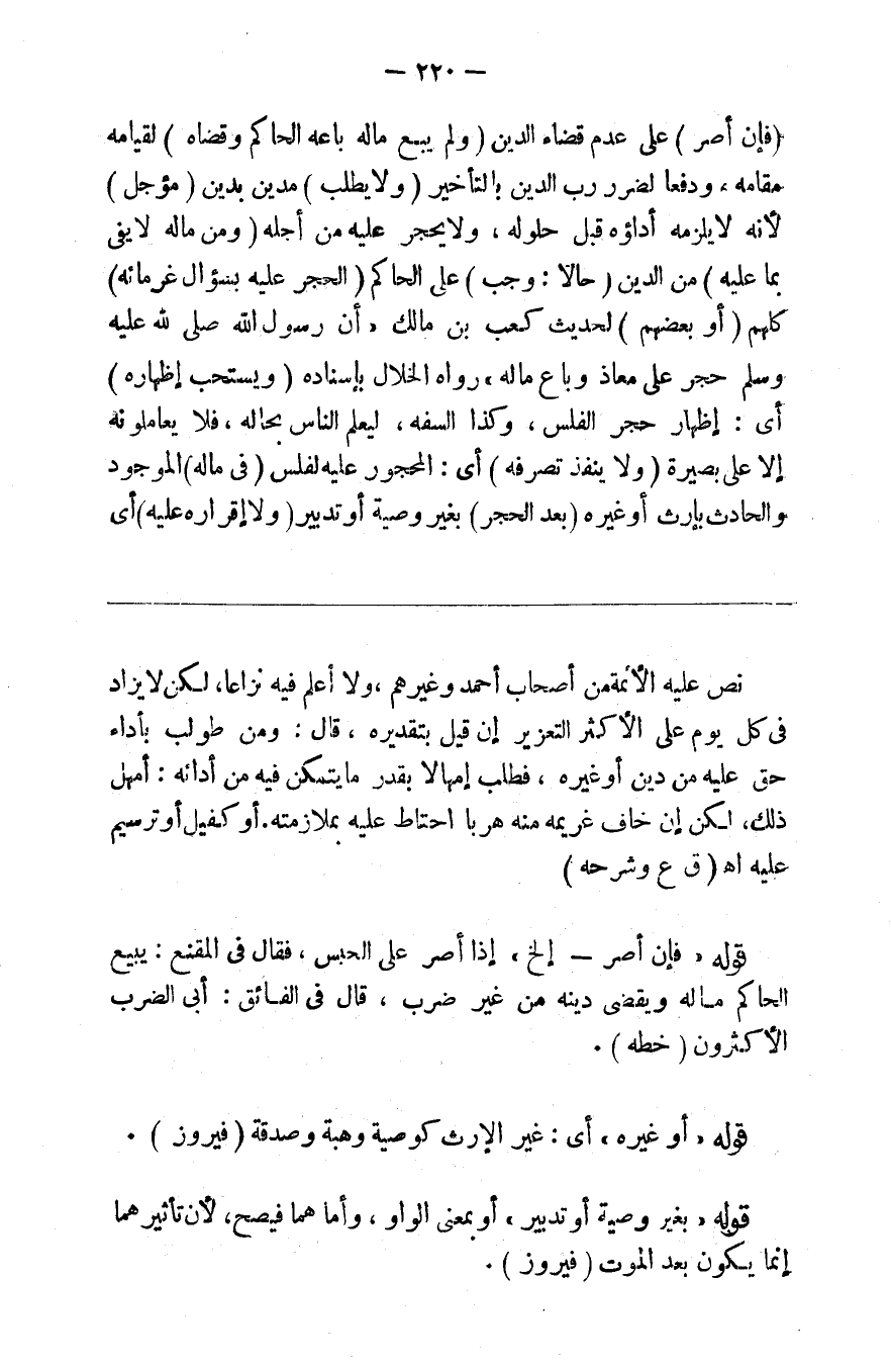 ( فإن أصر ) على عدم قضاء الدين ( ولم يبع ماله باعه الحاكم وقضاه ) لقيامه مقامه ودفعا لضرر رب الدين بالتأخير ( ولا يطالب ) مدين ( ب ) دين ( مؤجل ) لأنه لايلزمه أداؤه قبل حلوله ولا يحجر عليه من أجله ( ومن ماله لا يفي بما عليه ) من الدين ( حالا وجب ) على الحاكم ( الحجر عليه بسؤال غرمائه ) كلهم ( أو بعضهم ) لحديث كعب بن مالك إن رسول الله صلى الله عليه وسلم حجر على معاذ وباع ماله رواه الخلال بإسناده ( ويستحب إظهاره ) أي إظهار حجر المفلس وكذا السفيه ليعلم الناس بحاله فلا يعاملونه إلا على بصيرة ( ولا ينفذ تصرفه ) أي المحجور عليه لفلس ( في ماله ) الموجود والحادث بإرث أو غيره ( بعد الحجر ) بغير وصية أو تدبير ( ولا إقراره عليه ) أي