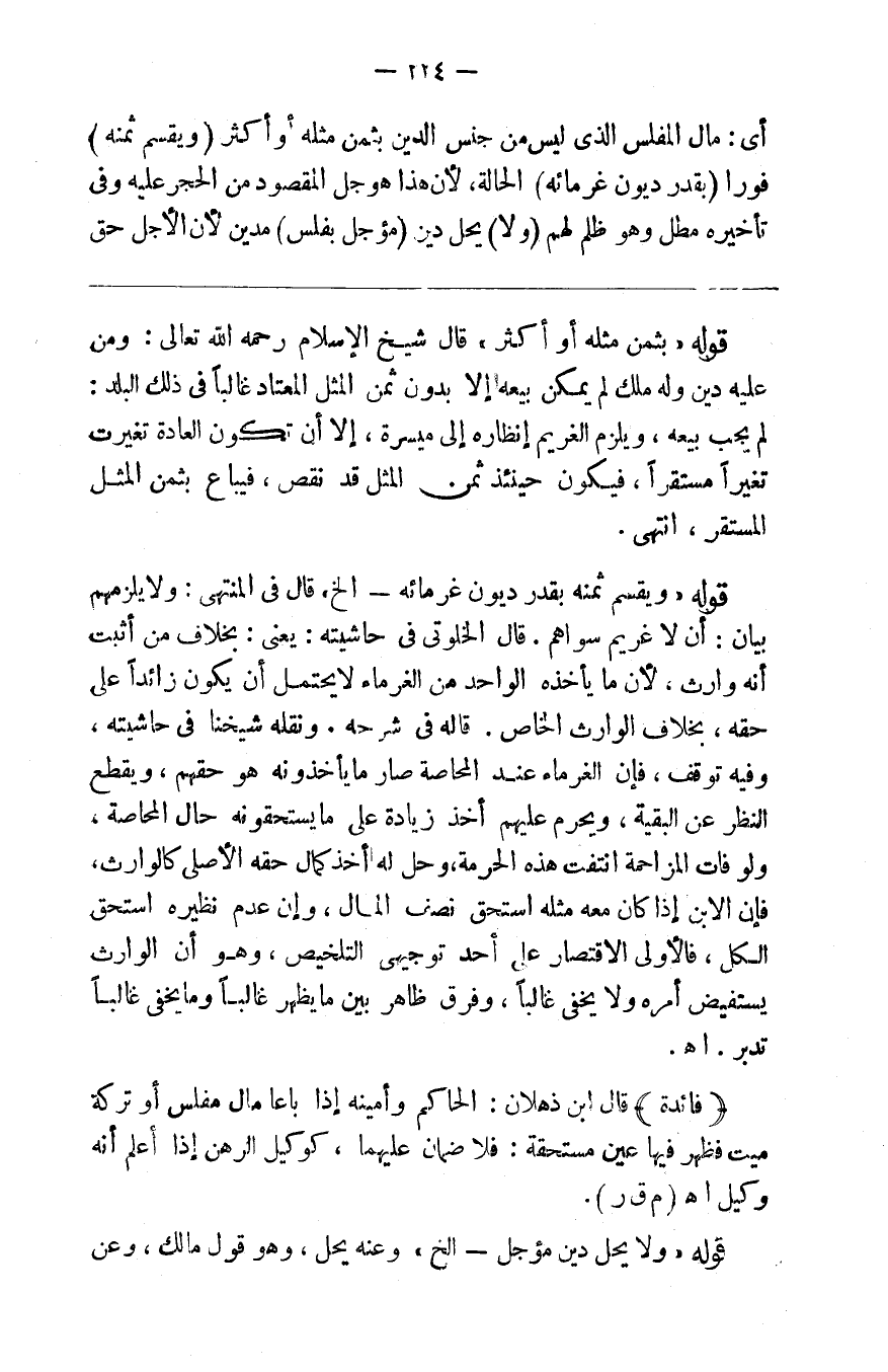 أي مال المفلس الذي ليس من جنس الدين بثمن مثله أو أكثر ( ويقسم ثمنه ) فورا ( بقدر ديون غرمائه ) الحالة لأن هذا هو جل المقصود من الحجر عليه وفي تأخيره مطل وهو ظلم لهم ( ولا يحل ) دين ( مؤجل بفلس ) مدين لأن الأجل حق