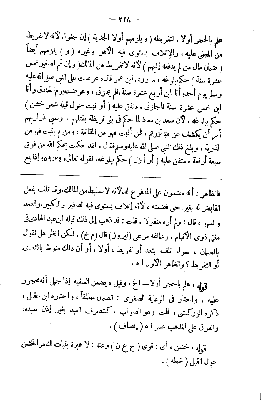 علم بالحجر أو لا لتفريطه ( ويلزمهم أرش الجناية ) إن جنوا لأنه لا تفريط من المجني عليه والإتلاف يستوي فيه الأهل وغيره ( و ) يلزمهم أيضا ( ضمان مال من لم يدفعه إليهم ) لأنه لا تفريط من المالك والإتلاف يستوي فيه الأهل وغيره ( وإن تم لصغير خمس عشرة سنة ) حكم ببلوغه لما روى ابن عمر قال عرضت على النبي صلى الله عليه وسلم يوم أحد وأنا ابن أربع عشرة سنة فلم يجزني وعرضت عليه يوم الخندق وأنا ابن خمس عشرة سنة فأجازني متفق عليه ( أو نبت حول قبله شعر خشن ) حكم ببلوغه لأن سعد بن معاذ لما حكم في بني قريظة بقتلهم وسبي ذراريهم أمر أن يكشف عن مؤتزرهم فمن أنبت فهو من المقاتلة ومن لم ينبت فهو من الذرية وبلغ ذلك النبي صلى الله عليه وسلم فقال لقد حكمت بحكم الله من فوق سبعة أرقعة متفق عليه ( أو أنزل ) حكم ببلوغه لقوله تعالى { وإذا بلغ الأطفال منكم الحلم فليستأذنوا }