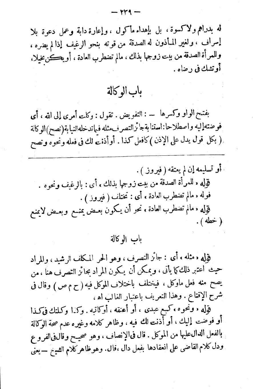له بدراهم ولا كسوة بل بإهداء مأكول وإعارة دابة وعمل دعوة بلا إسراف ولغير المأذون له الصدقة من قوته بنحو رغيف إذا لم يضره وللمرأة الصدقة من بيت زوجها بذلك ما لم تضطرب العادة أو يكن بخيلا أو تشك في رضاه 12 باب الوكالة الوكالة بفتح الواو وكسرها التفويض تقول وكلت أمري إلى الله أي فوضته إليه واصطلاحا استنابة جائز التصرف مثله فيما تدخله النيابة ( تصح ) الوكالة ( بكل قول يدل على الإذن ) ك افعل كذا أو أذنت لك في فعله ونحوه وتصح