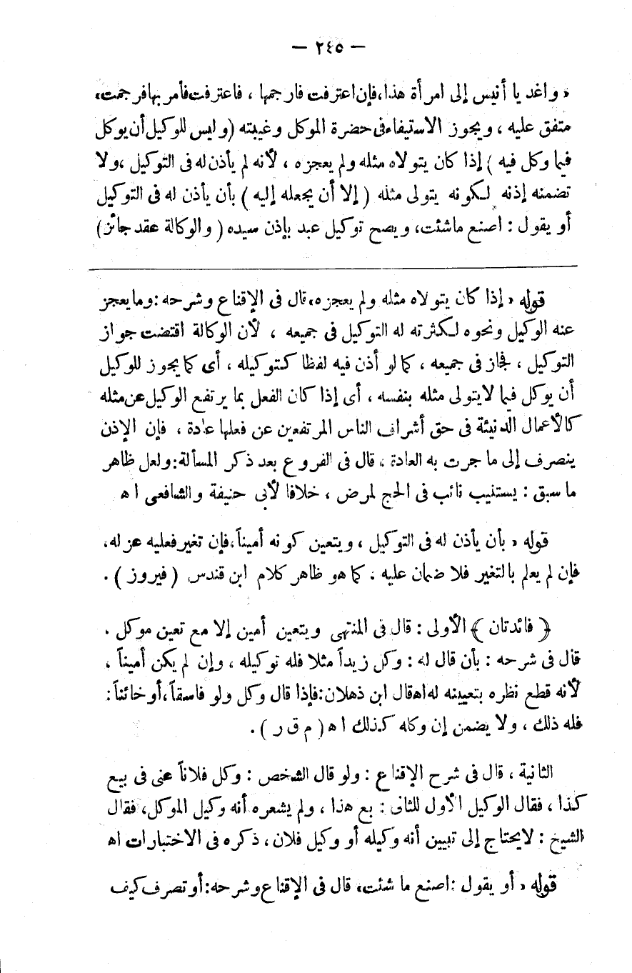 اغد يا أنيس إلى امرأة هذا فإن اعترفت فارجمها فاعترفت فأمر بها فرجمت متفق عليه ويجوز الاستيفاء في حضرة الموكل وغيبته ( وليس للوكيل أن يوكل فيما وكل فيه ) إذا كان يتولاه مثله ولم يعجزه لأنه لم يأذن له في التوكيل ولا تضمنه إذنه لكونه يتولى مثله ( إلا أن يجعل إليه ) بأن يأذن له في التوكيل أو يقول اصنع ماشئت ويصح توكيل عبد بإذن سيده ( والوكالة عقد جائز )