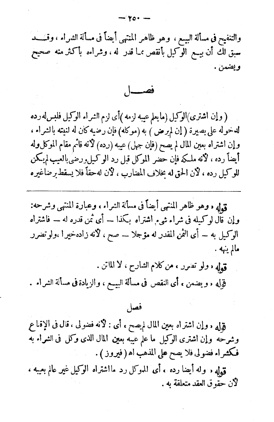 و التنقيح في مسألة البيع وهو ظاهر المنتهى أيضا في مسألة الشراء وقد سبق لك أن بيع الوكيل بأنقص مما قدر له وشراءه بأكثر منه صحيح ويضمن فصل ( وإن اشترى ) الوكيل ( مايعلم عيبه لزمه ) أي لزم الشراء الوكيل فليس له رده لدخوله على بصيرة ( وإن لم يرض ) به ( موكله ) فإن رضيه كان له لنيته بالشراء وإن اشتراه بعين المال لم يصح ( فإن جهل ) عيبه ( رده ) لأنه قائم مقام الموكل وله أيضا رده لأنه ملكه فإن حضر الموكل قبل رد الوكيل ورضي بالعيب لم يكن للوكيل رده لأن الحق له بخلاف المضارب لأن له حقا فلا يسقط برضى غيره
