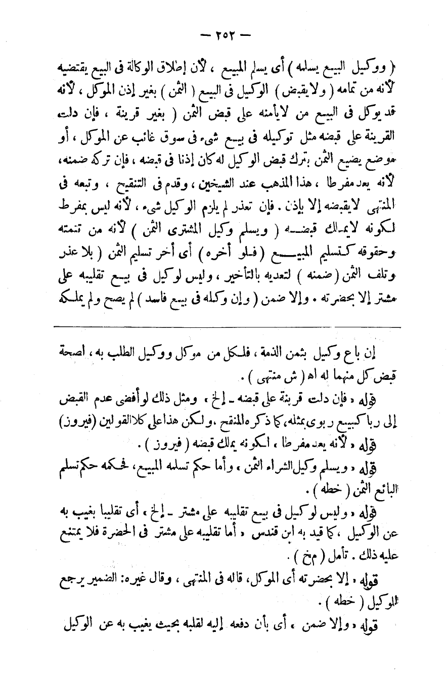 ( ووكيل البيع يسلمه ) أي يسلم المبيع لأن إطلاق الوكالة في البيع يقتضيه لأنه من تمامه ( ولا يقبض ) الوكيل في البيع ( الثمن ) بغير إذن الموكل لأنه قد يوكل في البيع من لا يأمنه على قبض الثمن ( بغير قرينة ) فإن دلت القرينة على قبضه مثل توكيله في بيع شيء في سوق غائبا عن الموكل أو موضع يضيع الثمن بترك قبض الوكيل له كان إذنا في قبضه فإن تركه ضمنه لأنه يعد مفرطا هذا المذهب عند الشيخين وقدم في التنقيح وتبعه في المنتهى لايقبضه إلا بإذن فإن تعذر لم يلزم الوكيل شيء لأنه ليس بمفرط لكونه لا يملك قبضه ( ويسلم وكيل المشتري الثمن ) لأنه من تتمته وحقوقه كتسليم المبيع ( فلو أخره ) أي أخر تسليم الثمن ( بلا عذر وتلف ) الثمن ( ضمنه ) لتعديه بالتأخير وليس لوكيل في بيع تقليبه على مشتر إلا بحضرته وإلا ضمن ( وإن وكله في بيع فاسد ) لم يصح ولم يملكه