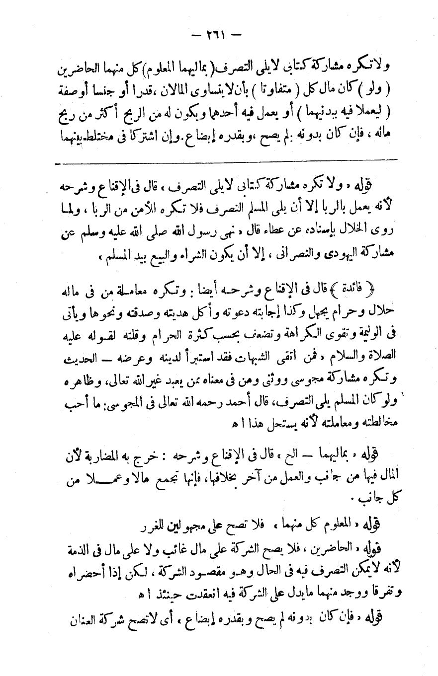 ولا تكره مشاركة كتابي لايلي التصرف ( بما ليهما المعلوم ) كل منهما الحاضرين ( ولو ) كان مال كل ( متفاوتا ) بأن لم يتساو المالان قدرا أو جنسا أو صفة ( ليعملا فيه ببدنيهما ) أو يعمل فيه أحدهما ويكون له من الربح أكثر من ربح مالة فإن كان بدونه لم يصح وبقدره إبضاع وإن اشتركا في مختلط بينهما