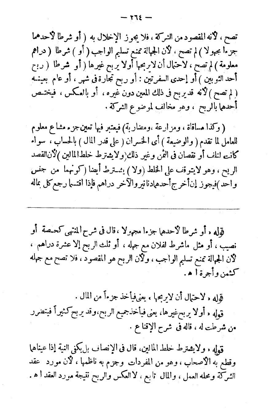 تصح لأنه المقصود من الشركة فلا يجوز الإخلال به ( أو شرطا لأحدهما جزءا مجهولا ) لم تصح لأن الجهالة تمنع تسليم الواجب ( أو ) شرطا ( دراهم معلومة ) لم تصح لاحتمال أن لايربحها أو يربح غيرها ( أو ) شرطا ( ربح أحد الثوبين ) أو إحدى السفرتين أو ربح تجارة في شهر أو عام بعينه ( لم تصح ) لأنه قد يربح في ذلك المعين دون غيره أو بالعكس فيختص أحدهما بالربح وهو مخالف لموضوع الشركة ( وكذا مساقاة ومزارعة ومضاربة ) فيعتبر فيها تعيين جزء مشاع معلوم للعامل لما تقدم ( والوضيعة ) أي الخسران ( على قدر المال ) بالحساب سواء كانت لتلف أو نقصان في الثمن أو غير ذلك ( ولا يشترط خلط المالين لأن القصد الربح وهو لايتوقف على الخلط ( ولا ) يشترط أيضا ( كونهما من جنس واحد ) فيجوز إن أخرج أحدهما دنانير والآخر دراهم فإذا اقتسما رجع كل بماله