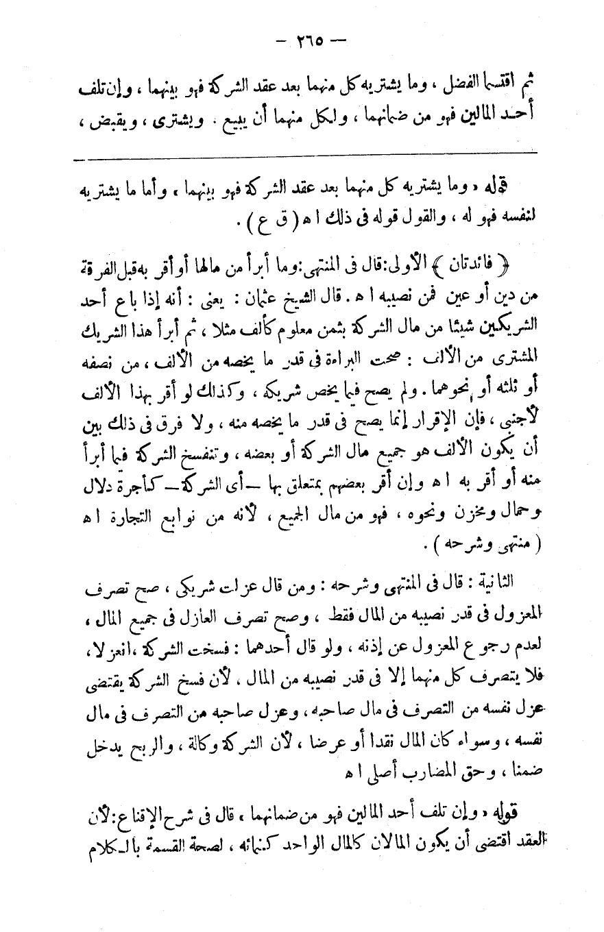 ثم اقتسما الفضل وما يشتريه كل منهما بعد عقد الشركة فهو بينهما وإن تلف أحد المالين فهو من ضمانهما ولكل منهما أن يبيع ويشتري ويقبض