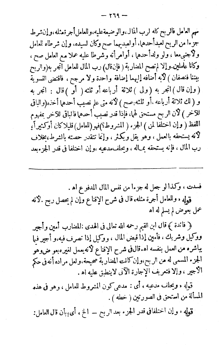 سهم العامل فالربح كله لرب المال والوضيعة عليه وللعامل أجرة مثله وإن شرط جزءا من الربح لعبد أحدهما أو لعبديهما صح وكان لسيده وإن شرطاه للعامل ولأجنبي معا ولو ولد أحدهما أو امرأته وشرطا عليه عملا مع العامل صح وكانا عاملين وإلا لم تصح المضاربة ( فإن قال ) رب المال للعامل اتجر به ( والربح بيننا فنصفان ) لأنه أضافه إليهما إضافة واحدة ولا مرجح فاقتضى التسوية ( وإن قال ) اتجر به ( ولي ) ثلاثة أرباعه أو ثلثه ( أو ) قال اتجر به و ( لك ) ( ثلاثة أرباعه أو ثلثه صح ) لأنه متى علم نصيب أحدهما أخذه ( والباقي للآخر ) لأن الربح مستحق لهما فإذا قدر نصيب أحدهما منه فالباقي للآخر بمفهوم اللفظ ( وإن اختلفا لمن ) الجزء ( المشروط ف ) هو ( لعامل ) قليلا كان أو كثيرا لأنه يستحقه بالعمل وهو يقل ويكثر وإنما تقدر حصته بالشرط بخلاف رب المال فإنه يستحقه بماله ويحلف مدعيه وإن اختلفا في قدر الجزء بعد