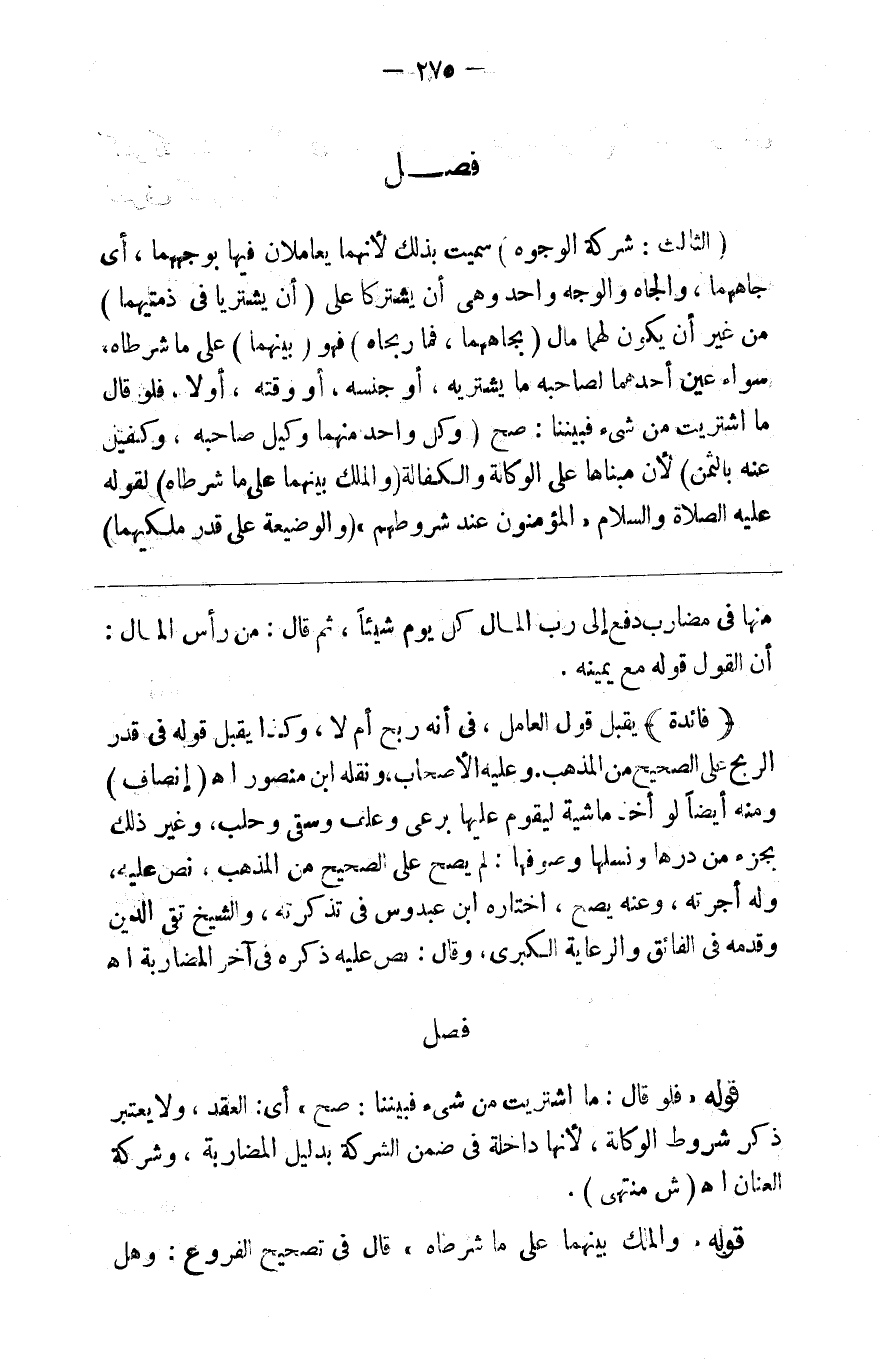 ( الثالث شركة الوجوه ) سميت بذلك لأنهما يعاملان فيها بوجههما أي جاههما والجاه والوجه واحد وهي أن يشتركا على ( أن يشتريا في ذمتيهما ) من غير أن يكون لهما مال ( بجاهيهما ) فما ربحاه ( ف ) هو ( بينهما ) على ما شرطاه سواء عين أحدهما لصاحبه ما يشتريه أو جنسه أو وقته أو لا فلو قال ما اشتريت من شيء فبيننا صح ( وكل واحد منهما وكيل صاحبه وكفيل عنه بالثمن ) لأن مبناهما على الوكالة والكفالة ( والملك بينهما على ماشرطاه ) لقوله صلى الله عليه وسلم المؤمنون عند شروطهم ( والوضيعة على قدر ملكيهما