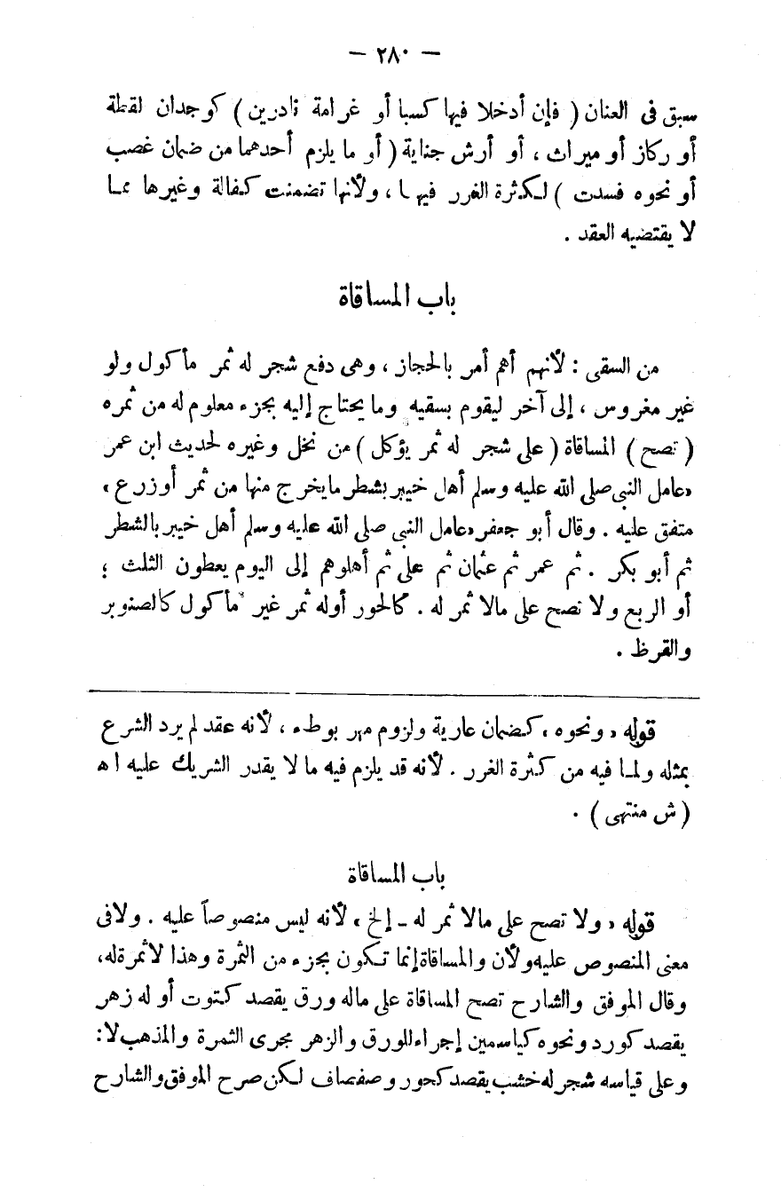 السقي من السقي لأنه أهم أمرها بالحجاز وهي دفع شجر له ثمر مأكول ولو غير مغروس إلى آخر ليقوم بسقيه وما يحتاج إليه بجزء معلوم له من ثمره ( تصح ) المساقاة ( على شجر له ثمر يؤكل ) من نخل وغيره لحديث ابن عمر عامل النبي صلى الله عليه وسلم أهل خيبر بشطر مايخرج منها من ثمر أو زرع متفق عليه وقال أبو جعفر عامل النبي صلى الله عليه وسلم أهل خيبر بالشطر ثم أبو بكر ثم عمر ثم عثمان ثم علي ثم أهلوهم إلى اليوم يعطون الثلث أو الربع ولا تصح على ما لا ثمر له كالحوز أو له ثمر غير مأكول كالصنوبر والقرظ