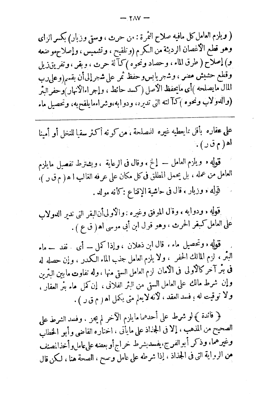 ( ويلزم العامل كل ما فيه صلاح الثمرة من حرث وسقي وزبار ) بكسر الزاي وهو قطع الأغصان الرديئة من الكرم ( وتلقيح وتشميس وإصلاح موضعه و ) إصلاح ( طرق الماء وحصاد ونحوه ) كآلة حرث وبقرة وتفريق زبل وقطع حشيش مضر وشجر يابس وحفظ ثمر على شجر إلى أن يقسم ( وعلى رب المال مايصلحه ) أي مايحفظ الأصل ( كسد حائط وإجراء الأنهار ) وحفر البئر ( والدولاب ونحوه ) كآلته التي تديره ودوابه وشراء مايلقح به وتحصيل ماء
