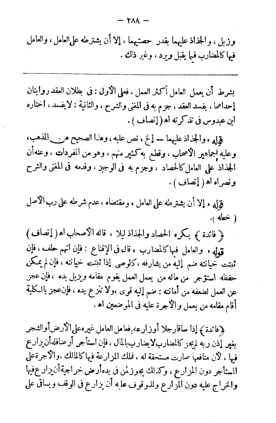 وزبل والجذاذ عليهما بقدر حصتيهما إلا أن يشترطه على العامل والعامل فيها كالمضارب فيما يقبل ويرد وغير ذلك %