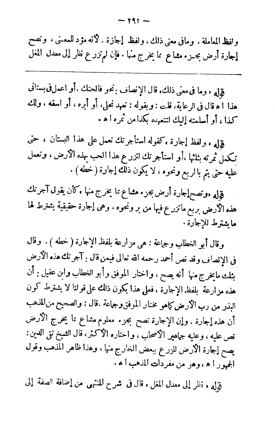 ولفظ العاملة وما في معنى ذلك ولفظ إجارة لأنه مؤد للمعنى وتصح إجارة أرض بجزء مشاع مما يخرج منها فإن لم تزرع نظر إلى معدل المغل