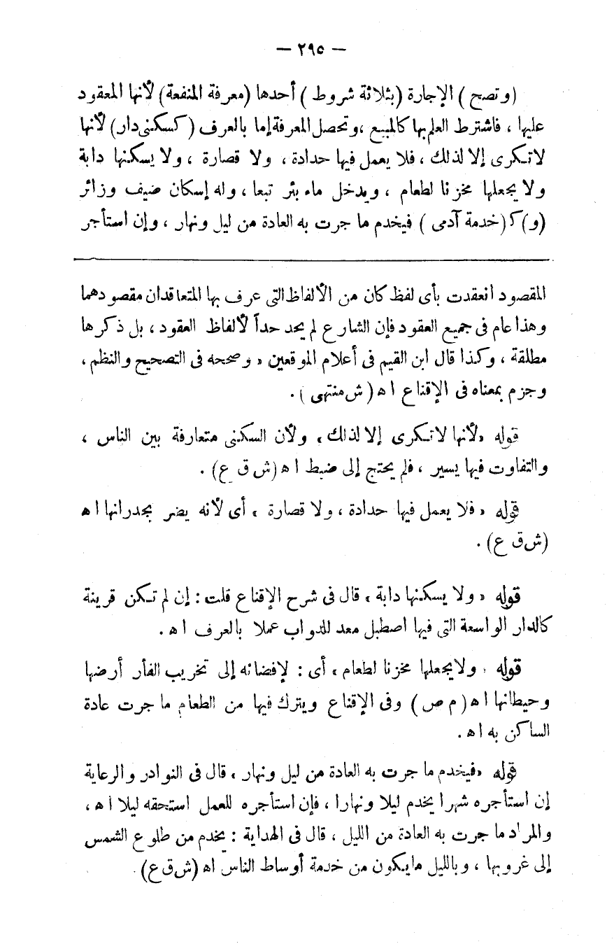 و ( تصح ) الإجارة ( بثلاثة شروط ) أحدها ( معرفة المنفعه ) لأنها المعقود عليها فاشترط العلم بها كالمبيع وتحصل المعرفة إما بالعرف ( كسكنى دار ) لأنها لا تكرى إلا لذلك فلا يعمل فيها حدادة ولا قصارة ولا يسكنها دابة ولا يجعلها مخزنا لطعام ويدخل ماء بئر تبعا وله إسكان ضيف وزائر ( و ) ك ( خدمة آدمي ) فيخدم ماجرت به العادة من ليل ونهار وإن استأجر