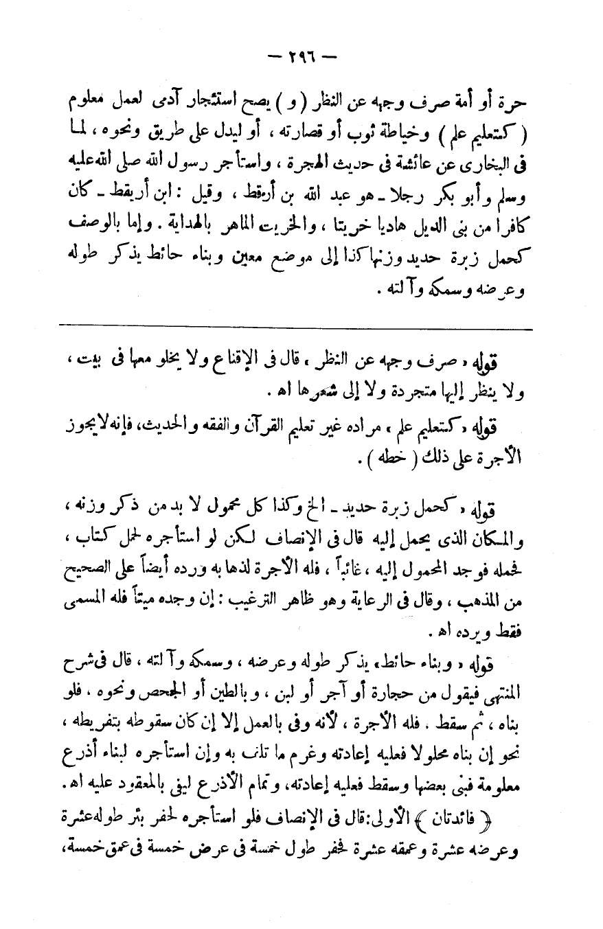 حرة أو أمة صرف وجهه عن النظر ( و ) يصح استئجار آدمي لعمل معلوم ك ( تعليم علم ) وخياطة ثوب أو قصارته أو ليدل على طريق ونحوه لما في البخاري عن عائشة في حديث الهجرة واستأجر رسول الله صلى الله عليه وسلم وأبو بكر رجلا هو عبد الله بن أرقط وقيل ابن أريقط كان كافرا من بني الديل هاديا خريتا والخريت الماهر بالهداية وإما بالوصف كحمل زبرة حديد وزنها كذا إلى موضع معين وبناء حائط يذكر طوله وعرضه وسمكه وآلته