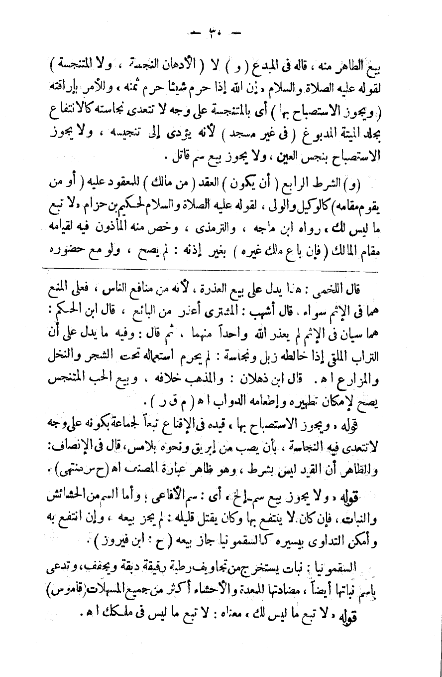 بيع الطاهر منه قاله في المبدع ( و ) لا ( الأدهان النجسة ولا المتنجسة ) لقوله صلى الله عليه وسلم إن الله إذا حرم شيئا حرم ثمنه وللأمر بإراقته ( ويجوز الاستصباح بها ) أي بالمتنجسة على وجه لاتتعدى نجاسته كالانتفاع بجلد الميتة المدبوغ ( في غير مسجد ) لأنه يؤدي إلى تنجيسه ولا يجوز الاستصباح بنجس العين ولا يجوز بيع سم قاتل ( و ) الشرط الرابع ( أن يكون ) العقد ( من مالك ) للمقعود عليه ( أو من يقوم مقامه ) كالوكيل والوالي لقوله صلى الله عليه وسلم لحكيم بن حزام لا تبع ما ليس عندك رواه ابن ماجه والترمذي وصححه وخص منه المأذون فيه لقيامه مقام المالك ( فإن باع ملك غيره ) بغير إذنه لم يصح ولو مع حضوره
