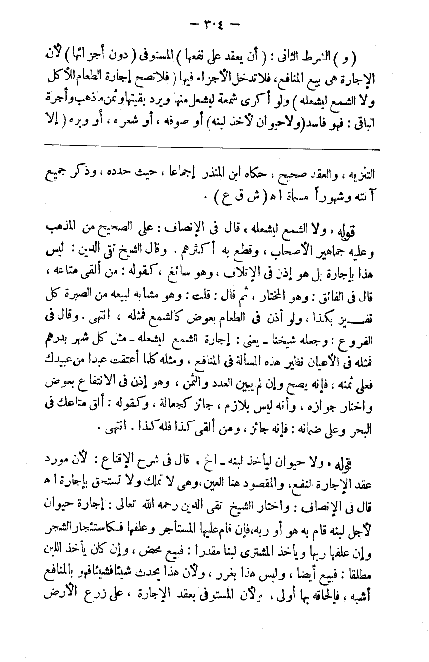 ( و ) الشرط الثاني ( أن يعقد على نفعها ) المستوفي ( دون أجزائها ) لأن الإجارة هي بيع المنافع فلا تدخل الأجزاء فيها ( فلا تصح إجارة الطعام للأكل ولا الشمع ليشعله ) ولو أكرى شمعة ليشعل منها ويرد بقيتها وثمن ماذهب وأجر الباقي فهو فاسد ( ولا حيوان ليأخذ لبنه ) أو صوفه أو شعره أو وبره ( إلا