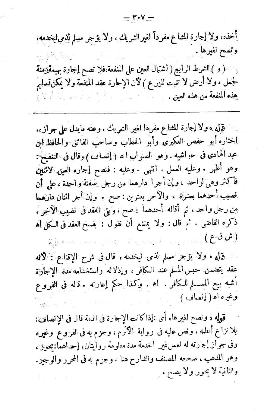 أخذه ولا إجارة المشاع مفردا لغير الشريك ولا يؤجر مسلم لذمي ليخدمه وتصح لغيرها ( و ) الشرط الرابع اشتمال العين على المنفعة فلا تصح إجارة بهيمة زمنة لحمل ولا أرض لا تنبت للزرع لأن الإجارة عقد على المنفعة ولا يمكن تسليم هذه المنفعة من هذه العين