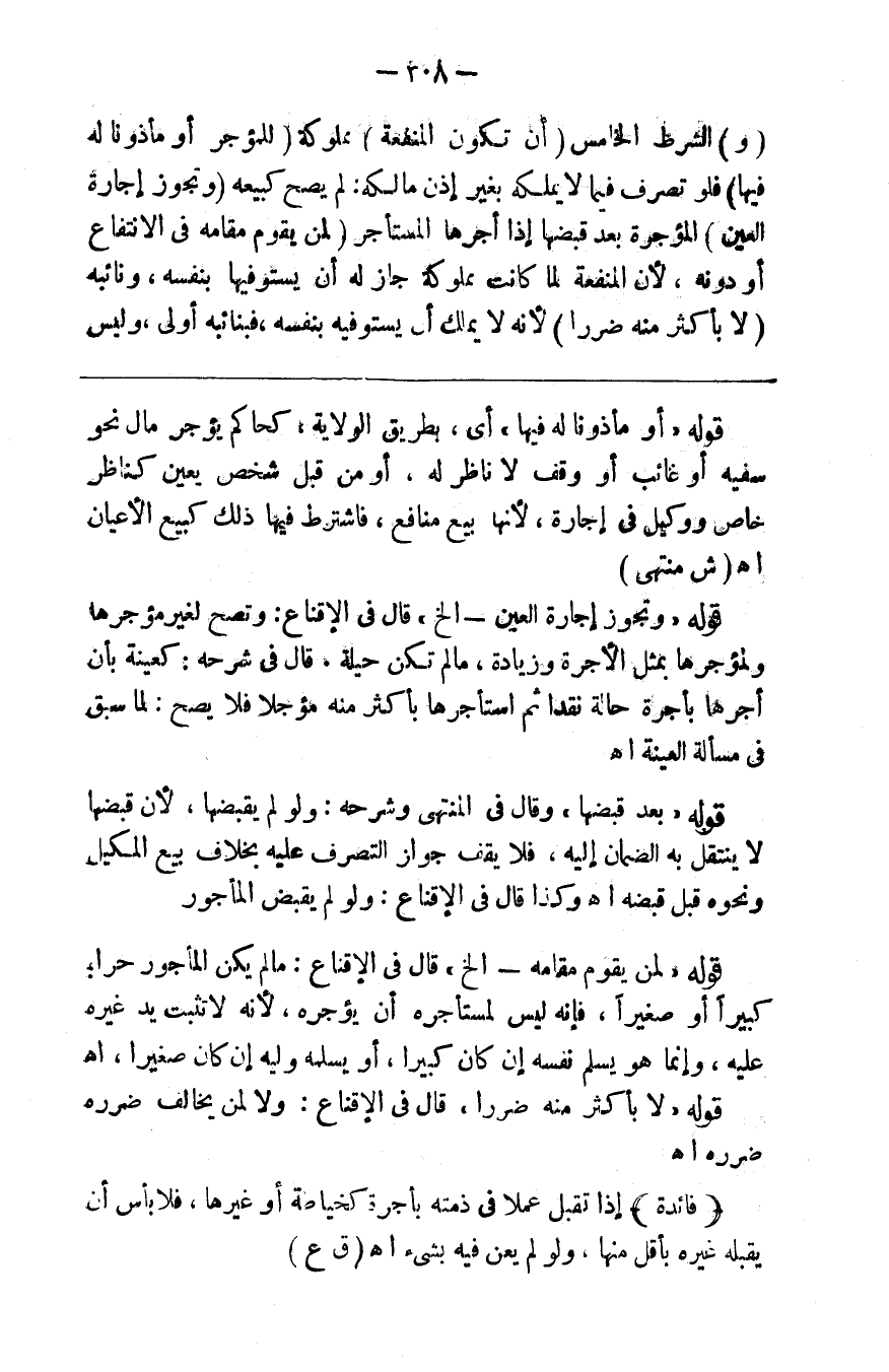 ( و ) الشرط الخامس ( أن تكون المنفعة ) مملوكة ( للمؤجر أو مأذونا له فيها ) فلو تصرف فيما لا يملكه بغير إذن مالكه لم يصح كبيعه ( وتجوز إجارة العين ) المؤجرة بعد قبضها إذا أجرها المستأجر ( لمن يقوم مقامه ) في الانتفاع أو دونه لأن المنفعة لما كانت مملوكة له جاز له أن يستوفيها بنفسه ونائبه ( لا بأكثر منه ضررا ) لأنه لايملك أن يستوفيه فبنائبه أولى وليس