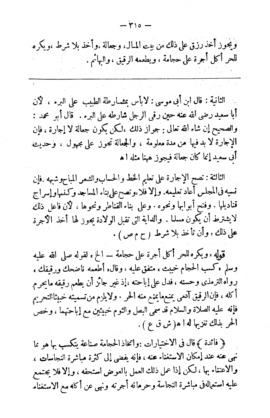 ويجوز أخذ رزق على ذلك من بيت المال وجعالة وأخذ بلا شرط ويكره للحر أكل أجرة على حجامة ويطعمه الرقيق والبهائم