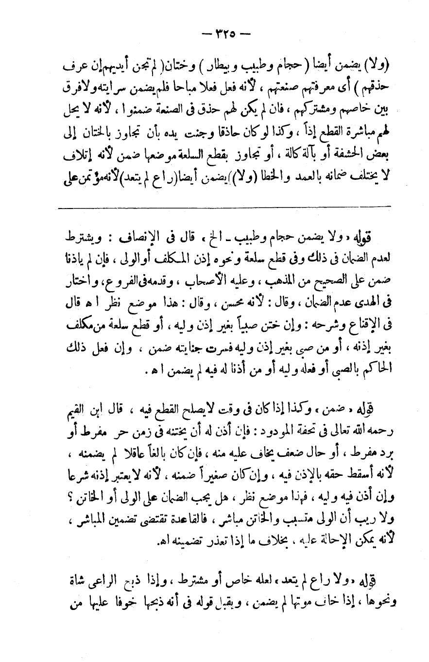 ( ولا ) يضمن أيضا ( حجام وطبيب وبيطار ) وختان ( لم تجن أيديهم إن عرف حذقهم ) أي معرفتهم صنعتهم لأنه فعل فعلا مباحا فلم يضمن سرايته ولا فرق بين خاصتهم ومشتركهم فإن لم يكن لهم حذق في الصنعة ضمنوا لأنه لايحل لهم مباشرة القطع إذا وكذا لو كان حاذقا وجنت يده بأن تجاوز بالختان إلى بعض الحشفة أو بآلة كالة أو تجاوز بقطع السلعة موضعها ضمن لأنه إتلاف لايختلف ضمانه بالعمد والخطأ ( ولا ) يضمن أيضا ( راع لم يتعد ) لأنه مؤتمن على