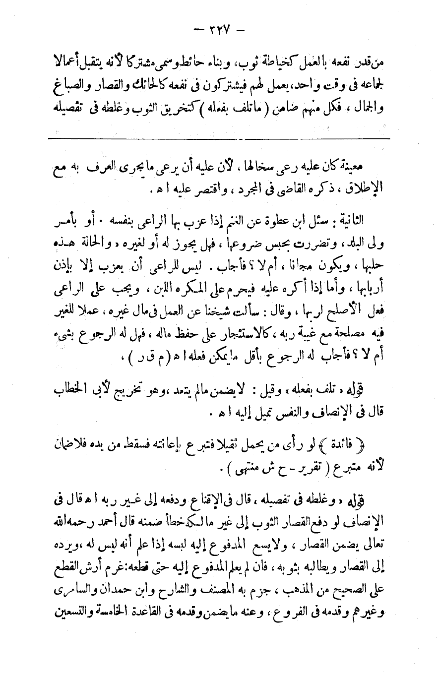 من قدر نفعه بالعمل كخياطة ثوب وبناء حائط سمي مشتركا لأنه يتقبل أعمالا لجماعة في وقت واحد يعمل لهم فيشتركون في نفعه كالحائك والقصار والصباغ والحمال فكل منهما ضامن ( ما تلف بفعله ) كتخريق الثوب وغلطه في تفصيله
