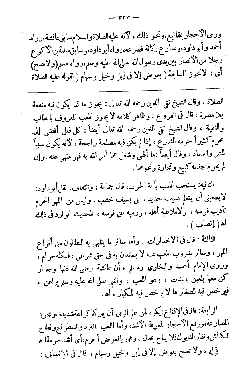 ورمي الأجحار بمقاليع ونحو ذلك لأنه صلى الله عليه وسلم سابق عائشة رواه أحمد وأبو داود وصارع ركانة فصرعه رواه أحمد أبو داود و سابق سلمة بن الأكوع رجلا من الأنصار بين يدى رسول الله صلى الله عليه وسلم رواه مسلم ( ولاتصح ) أي لا تجوز المسابقة ( بعوض إلا في إبل وخيل وسهام ) لقوله عليه الصلاة