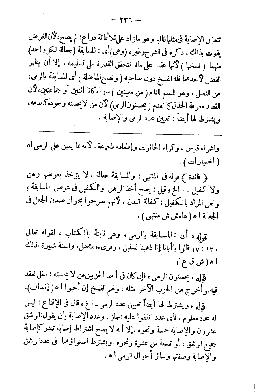 تتعذر الإصابة في مثلها غالبا وهو ما زاد على ثلاثمائة ذراع لم تصح لأن الغرض يفوت بذلك ذكره في الشرح وغيره ( وهي ) أي المسابقة ( جعالة لكل واحد ) منهما ( فسخها ) لأنها عقد على ما لا تتحقق القدرة على تسليمه إلا أن يظهر الفضل لأحدهما فله الفسخ دون صاحبه ( وتصح المناصلة ) أي المسابقة بالرمي من النصل وهو السهم التام ( على معينين ) سواء كان اثنين أو جماعتين لأن القصد معرفة الحذق كما تقدم ( يحسنون الرمي ) لأن من لا يحسنه وجوده كعدمه ويشترط لها أيضا تعيين عدد الرمي والإصابة