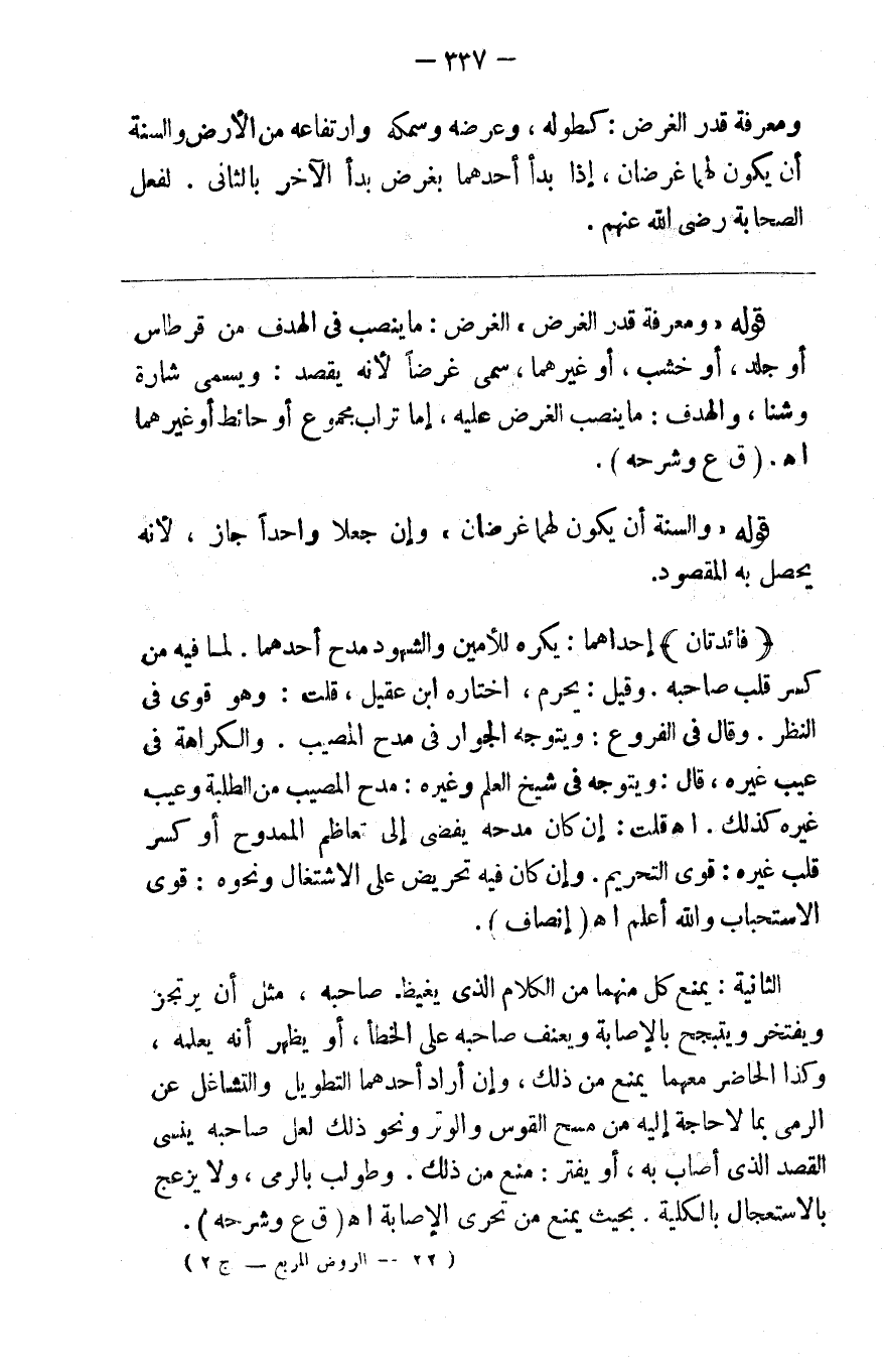 ومعرفة قدر الغرض كطوله وعرضه وسمكه وارتفاعه من الأرض والسنة أن يكون لهما غرضان إذا بدأ أحدهما بغرض بدأ الآخر بالثاني لفعل الصحابة رضي الله عنهم