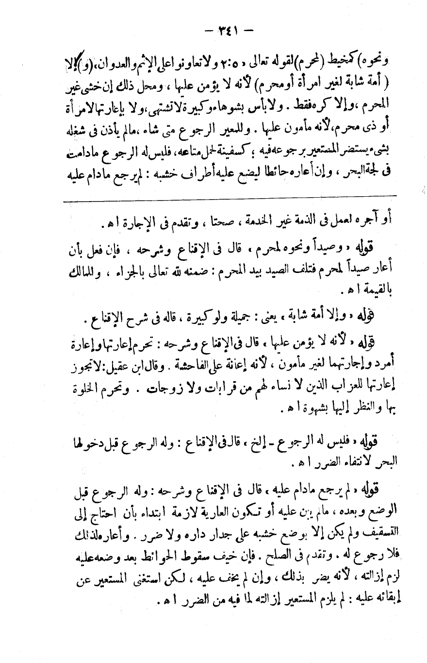 ونحوه ) كمخيط إلا ( أمة شابة لغير امرأة أو محرم ) لأنه لا يؤمن عليها ومحل ذلك إن خشي المحرم وإلا كره فقط ولا بأس بشوهاء وكبيرة لا تشتهى ولا بإعارتها لامرأة أو ذي محرم لأنه مأمون عليها وللمعير الرجوع متى شاء مالم يأذن في شغله بشيء يستضر المستعير برجوعه فيه كسفينة لحمل متاعه فليس له الرجوع ما دامت في لجة البحر وإن أعاره حائطا ليضع عليه أطراف خشبه لم يرجع ما دام عليه