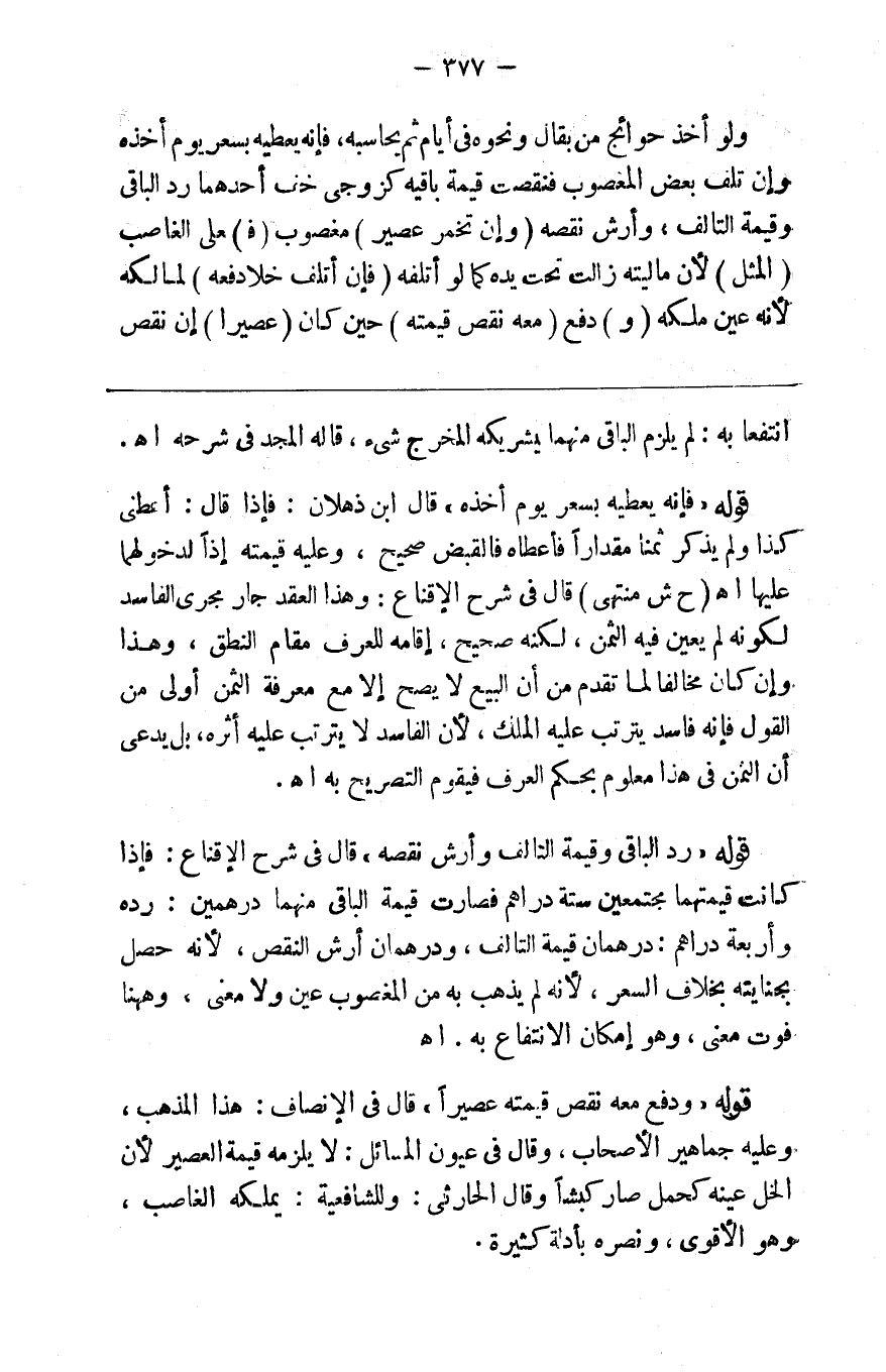 ولو أخذ حوائج من بقال ونحوه في أيام ثم حاسبه فإنه يعطيه بسعر يوم أخذه وإن تلف بعض المغصوب فنقصت قيمة باقيه كزوجي خف تلف أحدهما رد الباقي وقيمة الباقي وقيمة التالف وأرش نقصه ( وإن تخمر عصير ) مغصوب ( ف ) على الغاصب ( المثل ) لأن ماليته زالت تحت يده كما لو أتلفه ( فإن انقلب خلا دفعه ) لمالكه لأنه عين ملكه ( و ) دفع ( معه نقص قيمته ) حين كان ( عصيرا ) إن نقص
