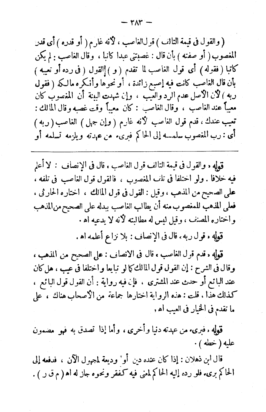 ( والقول في قيمة التالف ) قول الغاصب لأنه غارم ( أو قدره ) أي قدر المغصوب ( أو صفته ) بأن قال غصبتني عبدا كاتبا وقال الغاصب لم يكن كاتبا ف ( قوله ) أي قول الغاصب لما تقدم ( و ) القول ( في رده أو تعيبه ) بأن قال الغاصب كانت فيه أصبع زائدة أو نحوها وأنكره مالكه ف ( قول ربه ) لأن الأصل عدم الرد والعيب وإن شهدت البينة أن المغصوب كان معيبا وقال الغاصب كان معيبا وقت غصبه وقال المالك تعيب عندك قدم قول الغاصب لأنه غارم ( وإن جهل ) الغاصب ( ربه ) أي رب المغصوب سلمه إلى الحاكم فبرئ من عهدته ويلزمه تسلمه أو