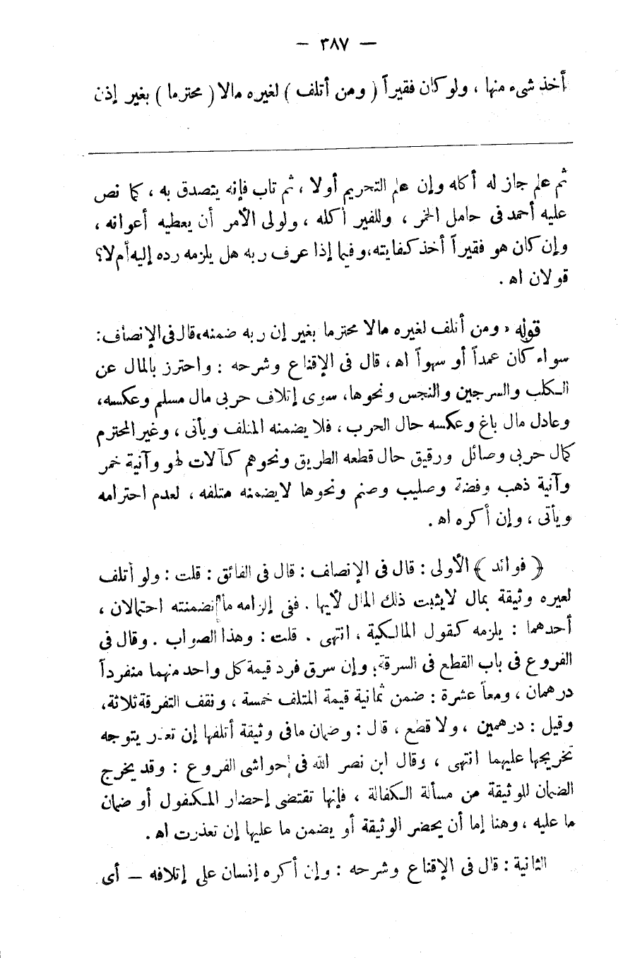 أخذ شيء منها ولو كان فقيرا ( ومن أتلف ) لغيره مالا ( محترما ) بغير إذن