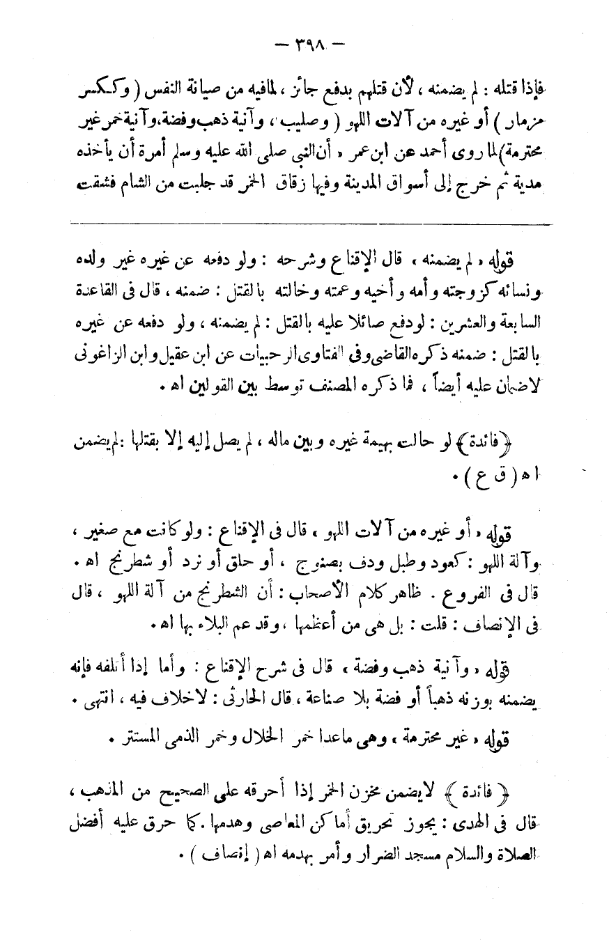 فإذا قتله لم يضمنه لأن قتله بدفع جائز لما فيه من صيانة النفس ( و ) ك ( كسر مزمار ) أو غيره من آلات اللهو ( وصليب وآنية ذهب وفضة وآنية خمر غير محترمة ) لما روى أحمد عن ابن عمر أن النبي صلى الله عليه وسلم أمره أن يأخد مدية ثم خرج إلى أسواق المدينة وفيها زقاق الخمر قد جلبت من الشام فشقت