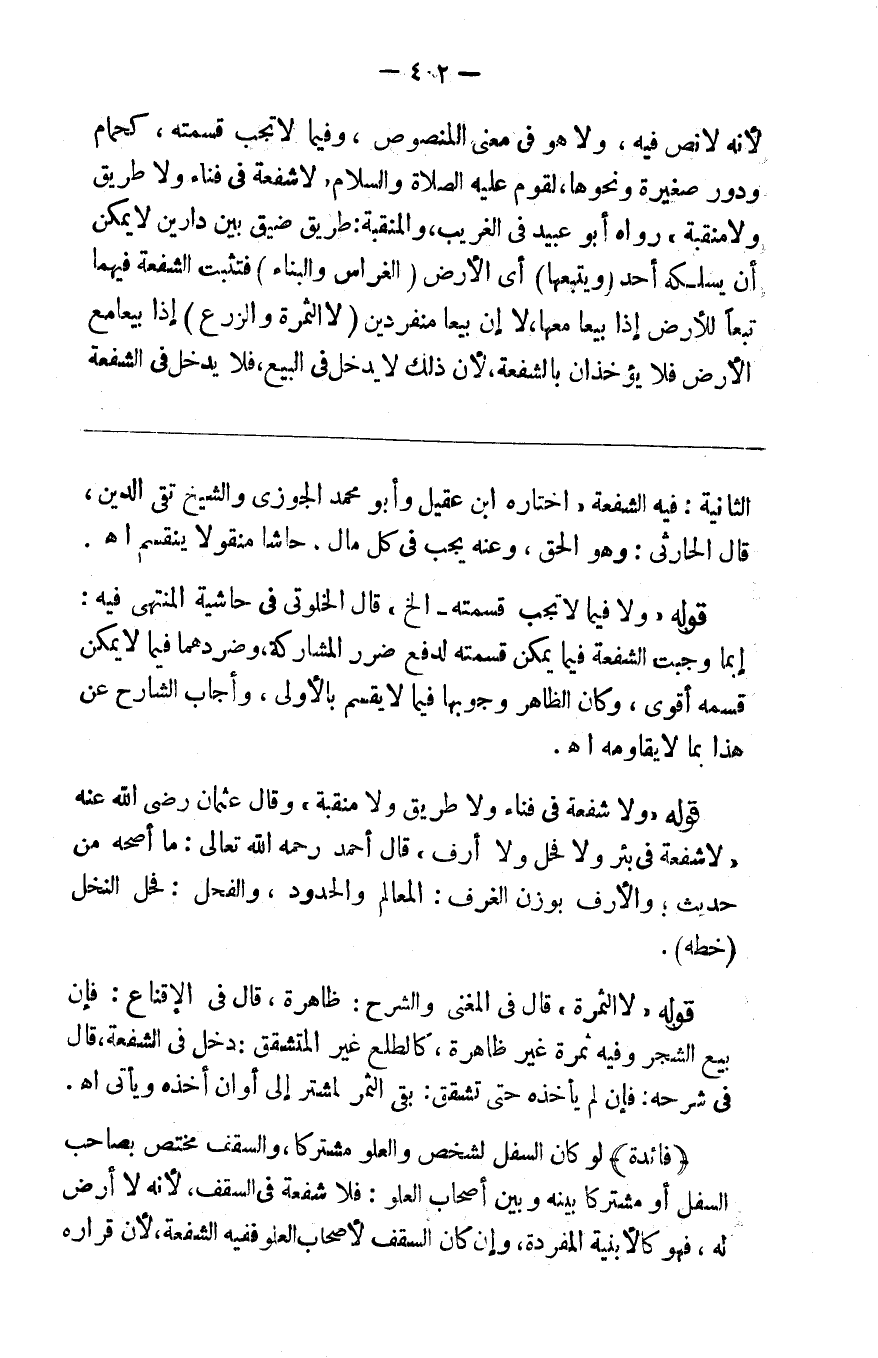 لأنه لا نص فيه ولا هو في معنى المنصوص ولا فيما لا تجب قسمته كحمام ودور صغيرة ونحوها لقوله صلى الله عليه وسلم لا شفعة في فناء ولا طريق ولا منقبة رواه أبو عبيدة في الغريب والمنقبة طريق ضيق بين دارين لا يمكن أن يسلكه أحد ( ويتبعها ) أي الأرض ( الغراس والبناء ) فتثبت الشفعة فيهما تبعا للأرض إذا بيعا معها لا إن بيعا منفردين ( لا الثمرة والزرع ) إذا بيعا مع الأرض فلا يؤخذان بالشفعة لأن ذلك لا يدخل في البيع فلا يدخل في الشفعة